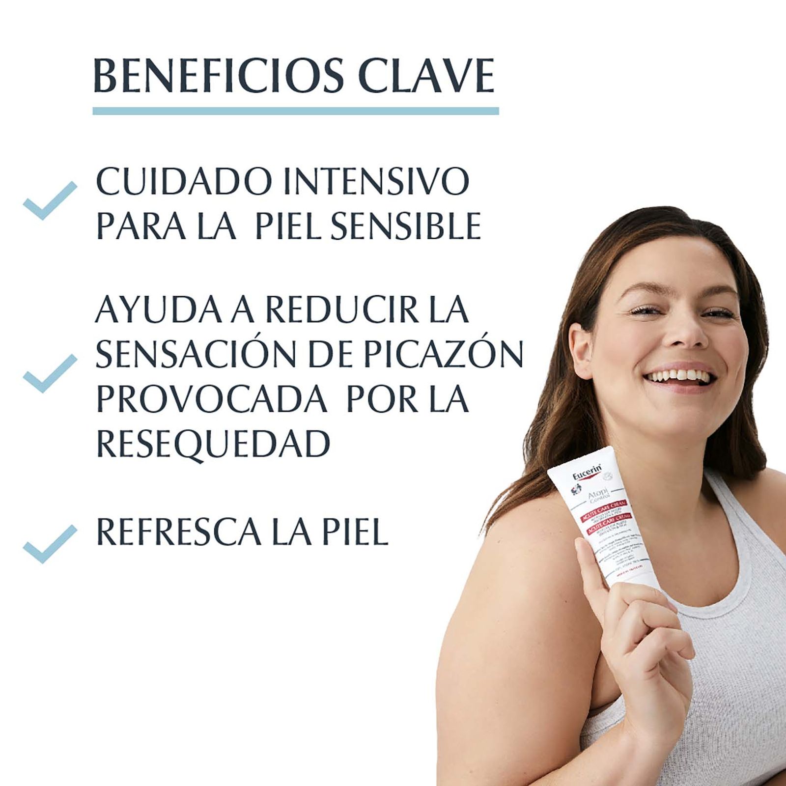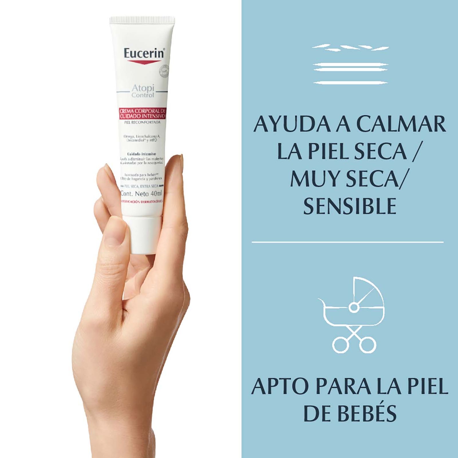 La Crema de cuidado intensivo Eucerin DAControl AtopiControl ayuda a disminuir las molestias ocasionadas por la resequedad, reduce la pérdida transepidérmica de agua y mejora significativamente la apariencia de la piel durante las fases de brote. Además, cuenta con ingredientes regenerativos, aliviadores, antipicazón, antibacteriales y refrescantes. Su fórmula contiene un complejo único que incluye Omega-6 (aceite de Onagra y aceite de semilla de uva), Licochalcona A (un extracto de la raíz de licorice), el antibacterial Decanediol y el refrescante Menthoxypropanediol. No es un producto farmacéutico y no pretende reemplazar a uno. Está probada en la piel atópica de los adultos, niños y bebés desde los tres meses.
