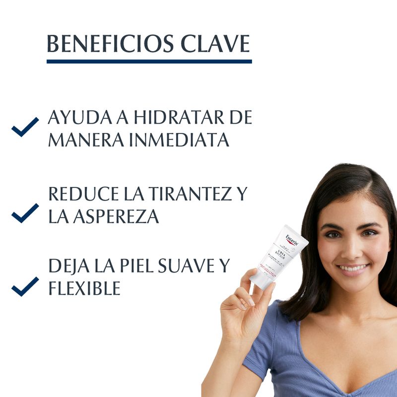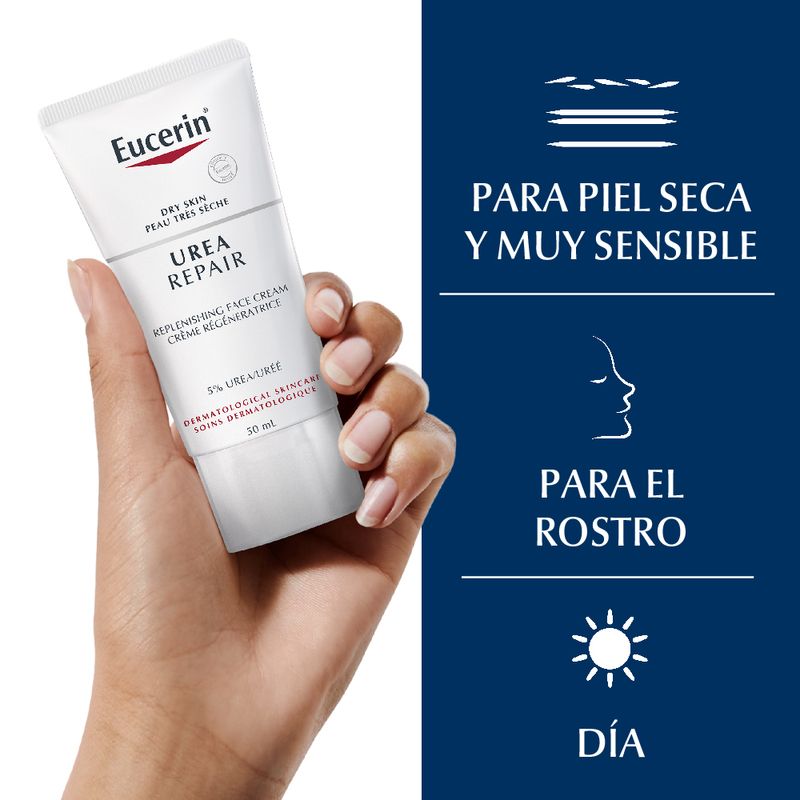 La Crema emoliente facial Eucerin UreaRepair PLUS 5% humecta instantáneamente y reconforta la tirantez, dándole a la piel una sensación de suavidad y elasticidad. Su fórmula contiene Urea y Lactato, ingredientes que ayudan a restaurar el balance natural de hidratación. También, posee Carnitina para fortalecer la barrera natural de la piel y protegerla de la pérdida de humectación. Está probada en piel seca y es ideal para usar como base de maquillaje o después de afeitar.
