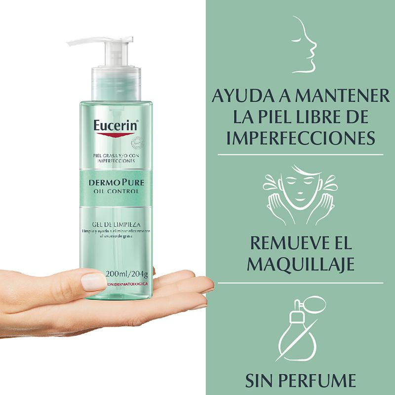 El Gel limpiador Eucerin DermoPURE Oil Control cuenta con Surfactante Anfóteros que limpian la piel suavemente, removiendo la suciedad, maquillaje y el exceso de grasa de forma efectiva. Deja en la piel una sensación de limpieza, frescura y suavidad. Su envase está elaborado con 98% de material reciclable. Está probado su excelente tolerancia y eficacia en pacientes con piel grasa con impurezas y con espinillas. Somos una de las empresas líderes en el cuidado de la piel a nivel internacional y, como tales, estamos cerca de nuestros consumidores para ofrecerles productos atractivos e innovadores. En Eucerin® nos dedicamos a la ciencia del cuidado dermatológico de la piel en grado farmacéutico durante más de 100 años. Estamos constantemente en búsqueda de avances científicos, y nos comprometemos a desarrollar soluciones efectivas, altamente tolerables y clínicamente probadas. Desarrollamos nuestros productos para mantener y mejorar la salud y la belleza de tu piel. Porque sabemos que sólo los resultados tangibles y visibles pueden resolver los problemas de tu piel y ayudar a mejorar tu bienestar diario. Sabemos que los efectos de nuestras soluciones para la piel van más allá de la piel, nuestra piel es mucho más que el escudo protector de nuestro cuerpo.