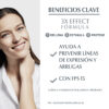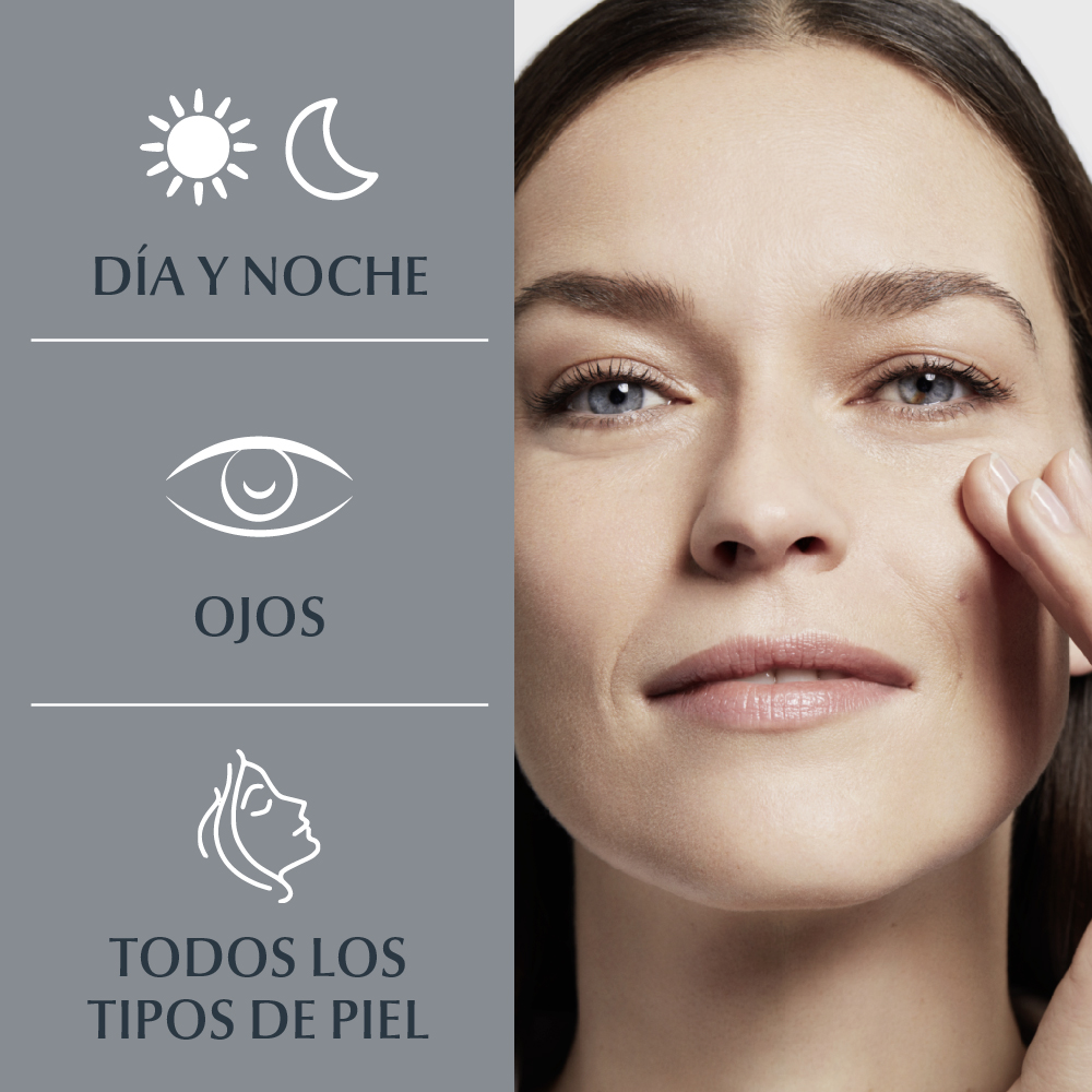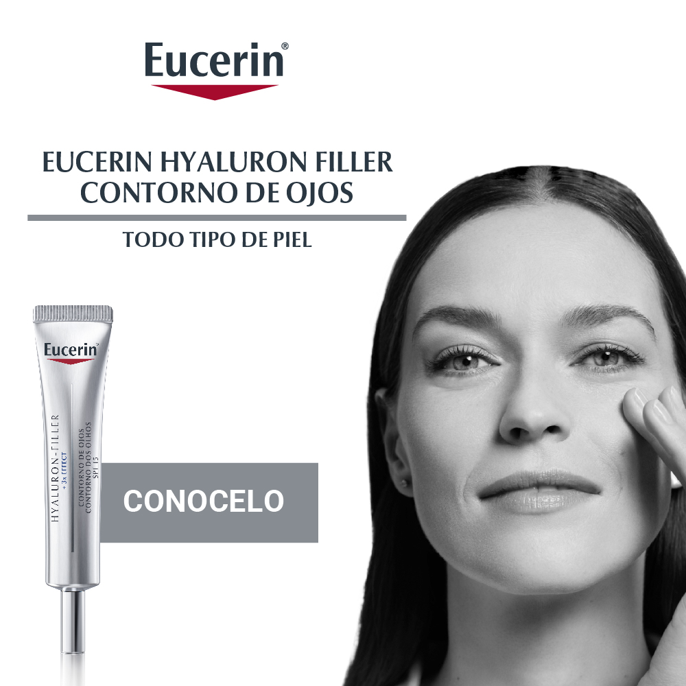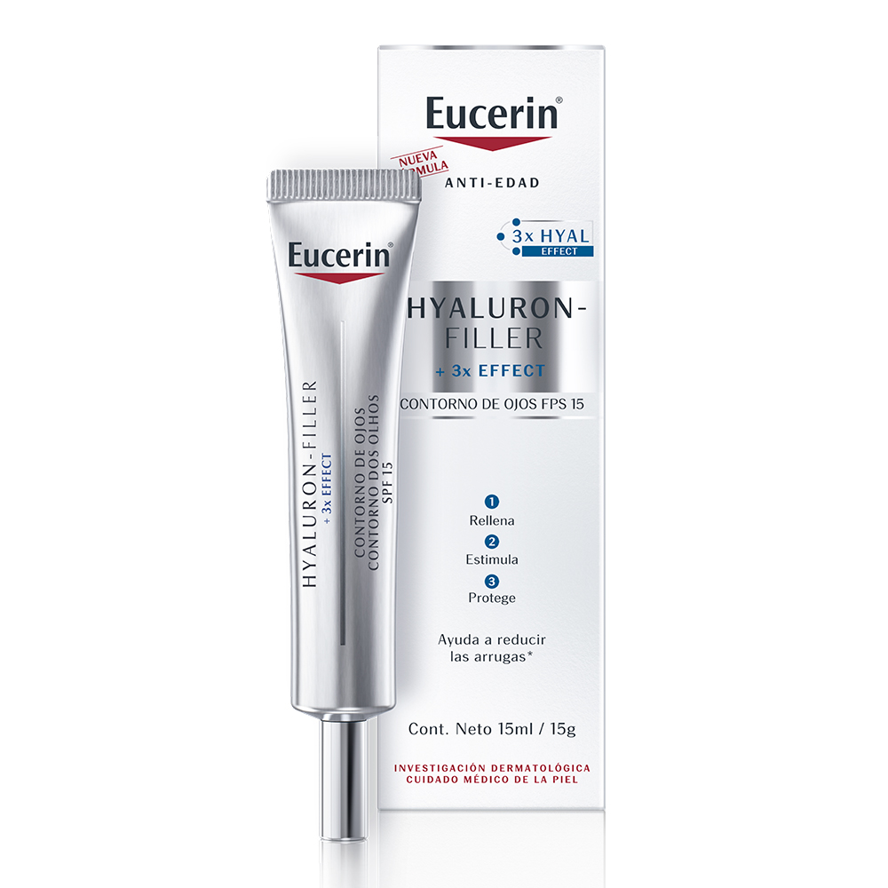El Contorno de ojos antiarrugas Eucerin HYALURON FILLER + 3x Effect fue especialmente desarrollado para actuar sobre las “patas de gallo” en la delicada área de los ojos, logrando un efecto relleno. Su fórmula combina tres ingredientes claves: Ácido Hialurónico, Glicina Saponina y Enoxolona, que ayudan a reducir visiblemente los signos del envejecimiento, estimulan la producción natural de ácido hialurónico y previenen su degradación natural. Contiene FPS 15 y está probada en todo tipo de pieles.