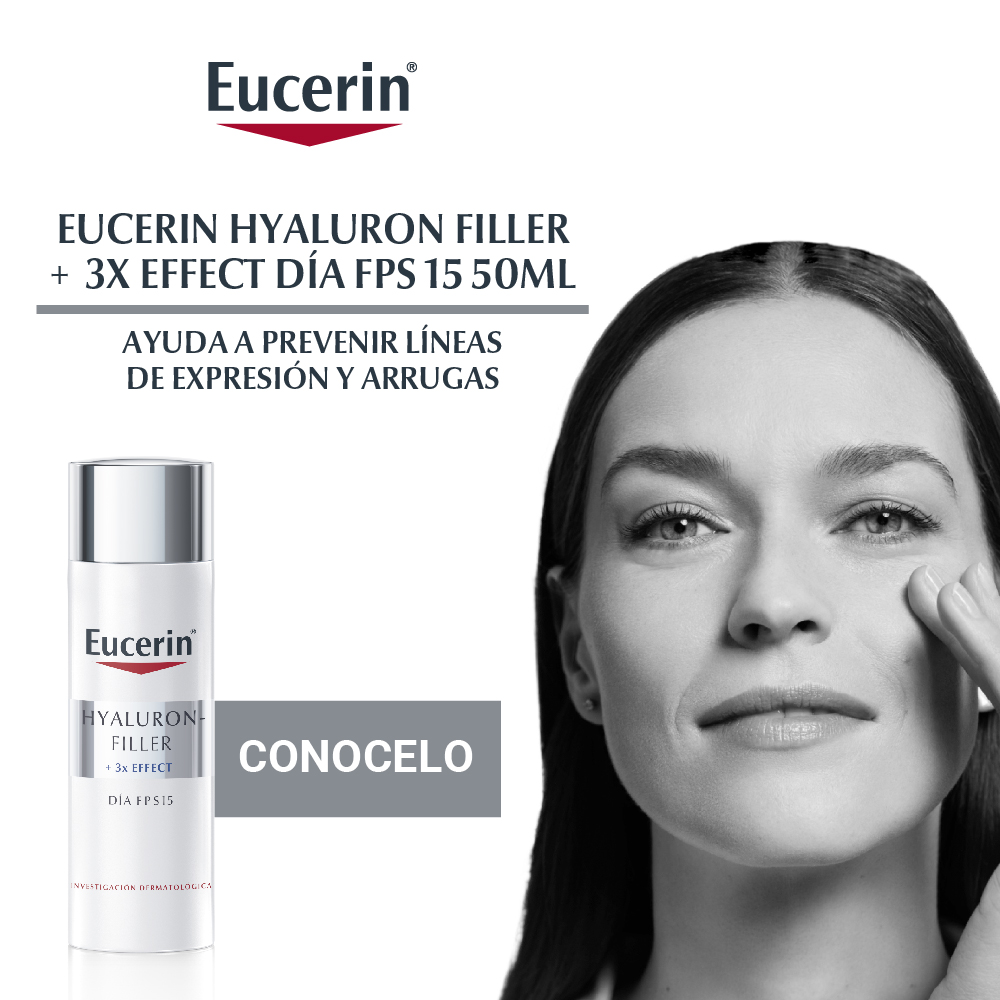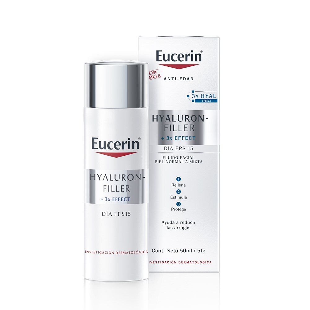 La Crema antiarrugas de día Eucerin HYALURON-FILLER + 3x Effect ayuda a reducir visiblemente las líneas de expresión y las arrugas para una apariencia rejuvenecida. Su fórmula con Ácido Hialurónico, ayuda a reducir visiblemente los signos del envejecimiento; Glicina Saponina, estimulando la producción natural de ácido hialurónico; y Enoxolona, para prevenir la degradación del ácido hialurónico de la piel. Contiene FPS 15 y está probada en piel normal a mixta.