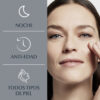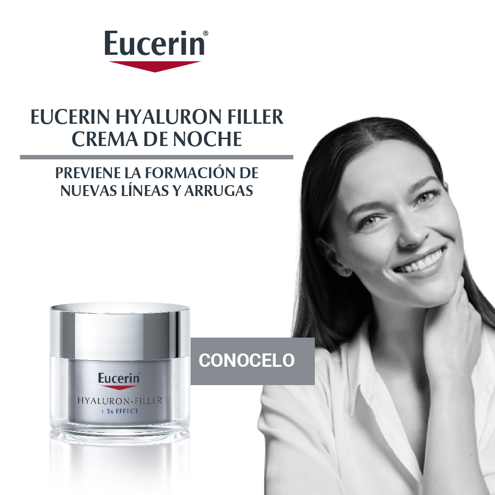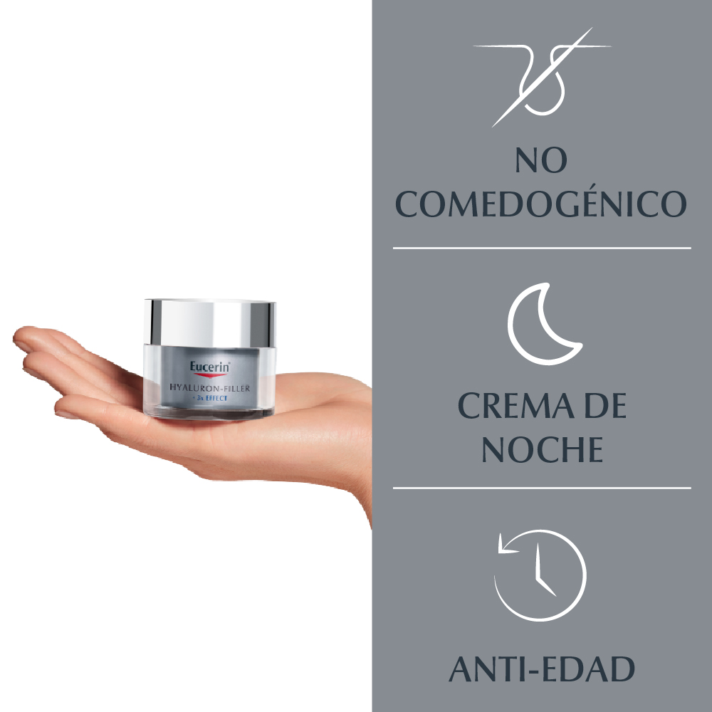 La Crema antiarrugas de noche Eucerin HYALURON-FILLER + 3x Effect genera un efecto relleno de arrugas para que la piel se sienta suave y cuidada. Su fórmula combina tres ingredientes claves: Ácido Hialurónico, Glicina Saponina y Enoxolona, que ayudan a reducir visiblemente los signos del envejecimiento, estimulan la producción natural de ácido hialurónico y previenen su degradación natural. No comedogénica y está probada en todo tipo de pieles.