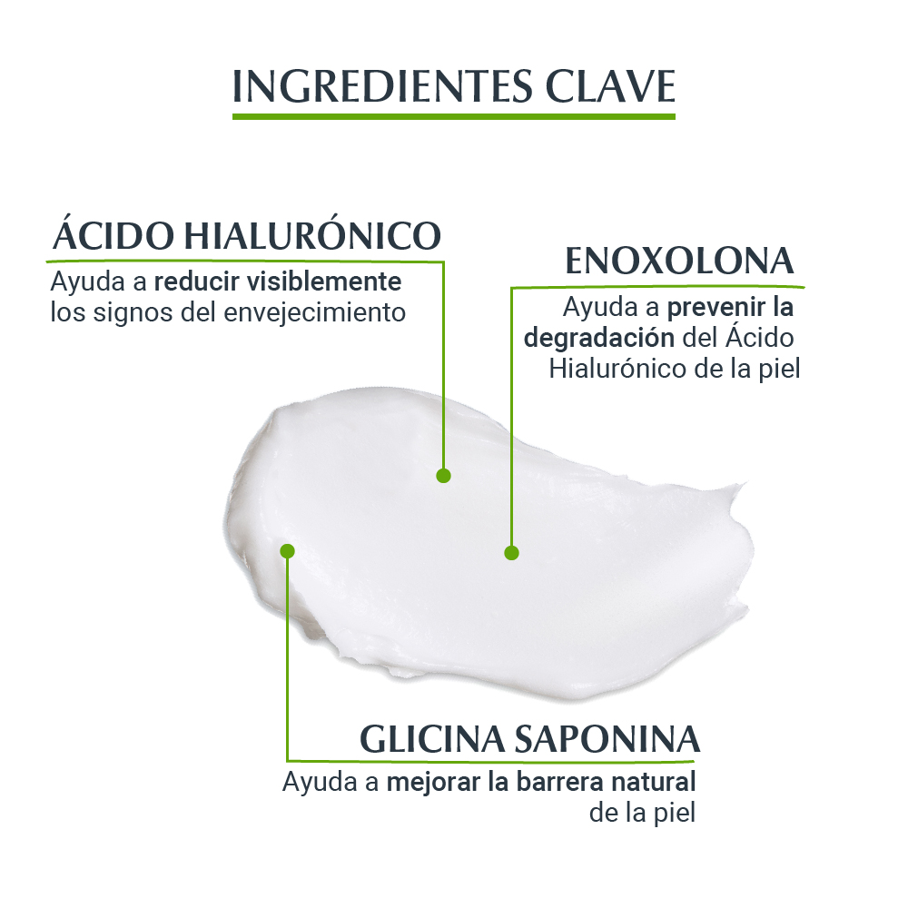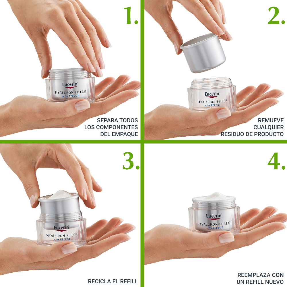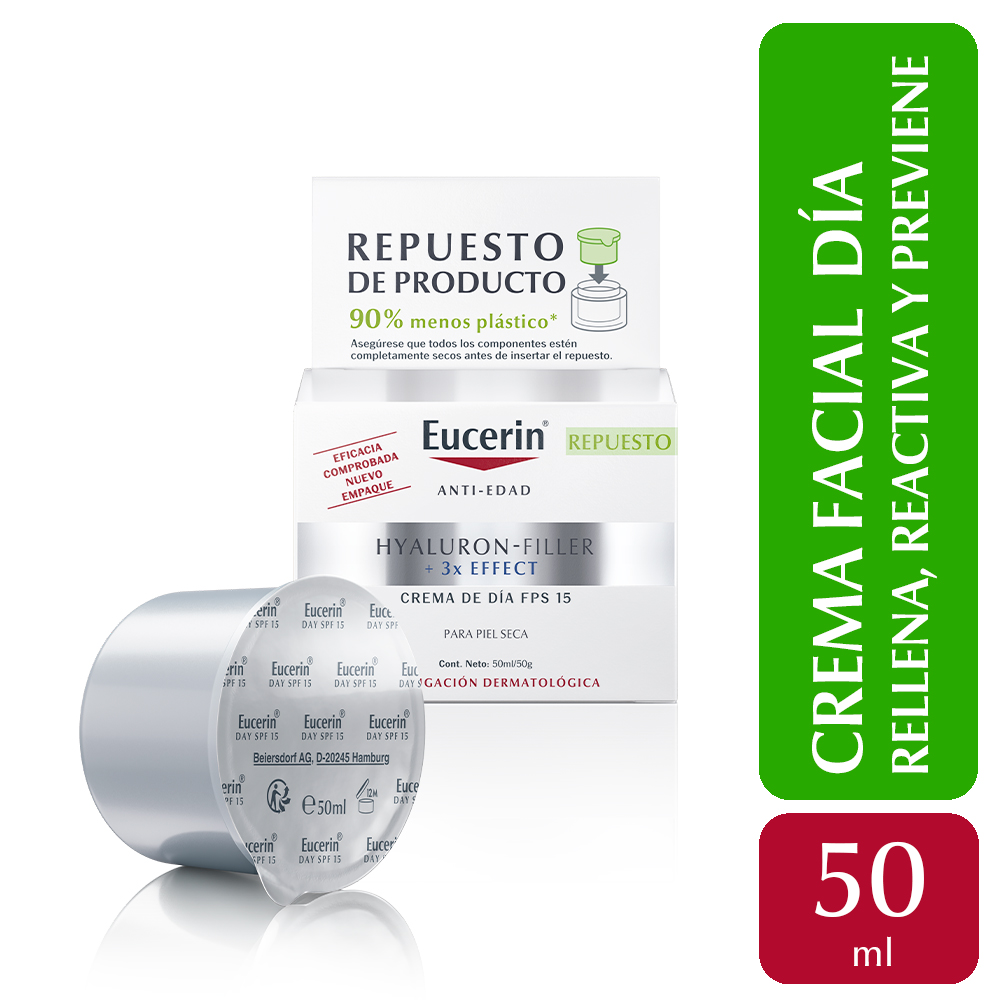 El Repuesto de la Crema antiarrugas de día Eucerin HYALURON-FILLER + 3x Effect ayuda a reducir visiblemente los signos de envejecimiento y genera un efecto relleno de arrugas para que la piel se sienta suave y cuidada. Su fórmula combina tres ingredientes: Ácido Hialurónico, Glicina Saponina y Enoxolona, que reducen a reducir arrugas, a estimular la producción de Ácido Hialurónico y a prevenir su degradación. La crema contiene FPS 15, su empaque contiene 90% menos plástico que el tarro regular y está probada para piel seca.