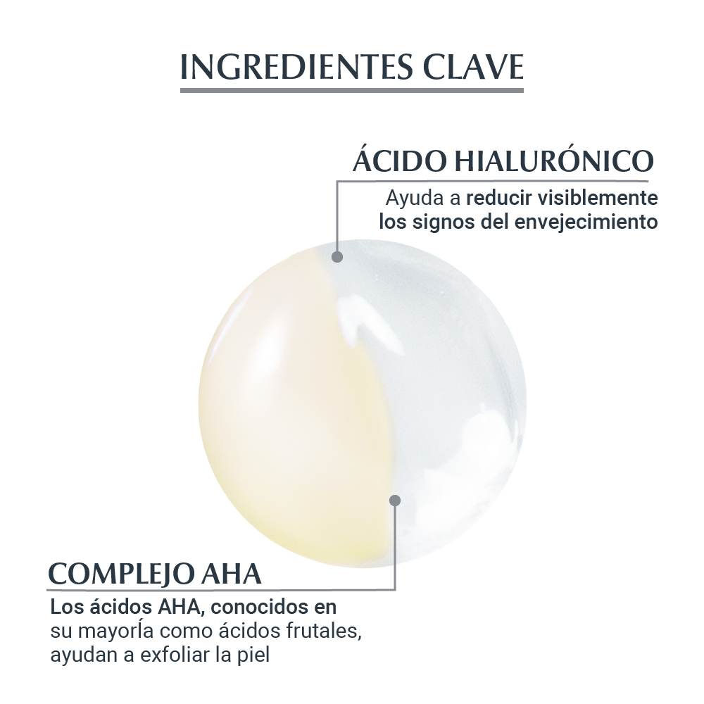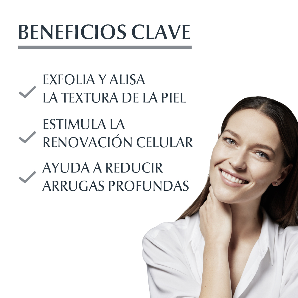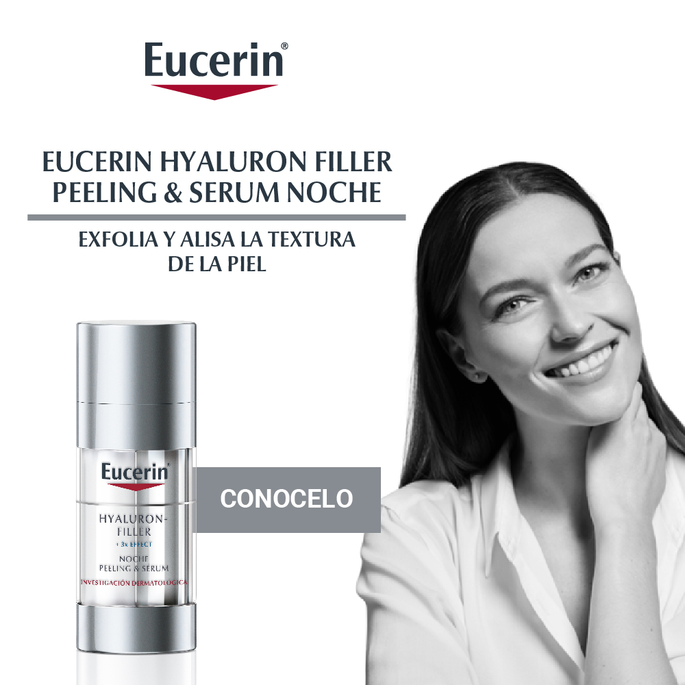 El Sérum efecto peeling Eucerin HYALURON-FILLER + 3x Effect es un producto nocturno de acción dual que exfolia y alisa la textura de la piel, estimulando la renovación celular y ayudando a rellenar las arrugas. La emulsión contiene dos ingredientes principales: el efectivo complejo AHA (Álfa Hidroxi Ácidos) compuesto por ácidos frutales que exfolian la piel, y Ácido Hialurónico que ayuda a reducir visiblemente los signos del envejecimiento.. Por eso, la piel lucirá más suave con textura y luminosidad. Está probado en todo tipo de pieles.