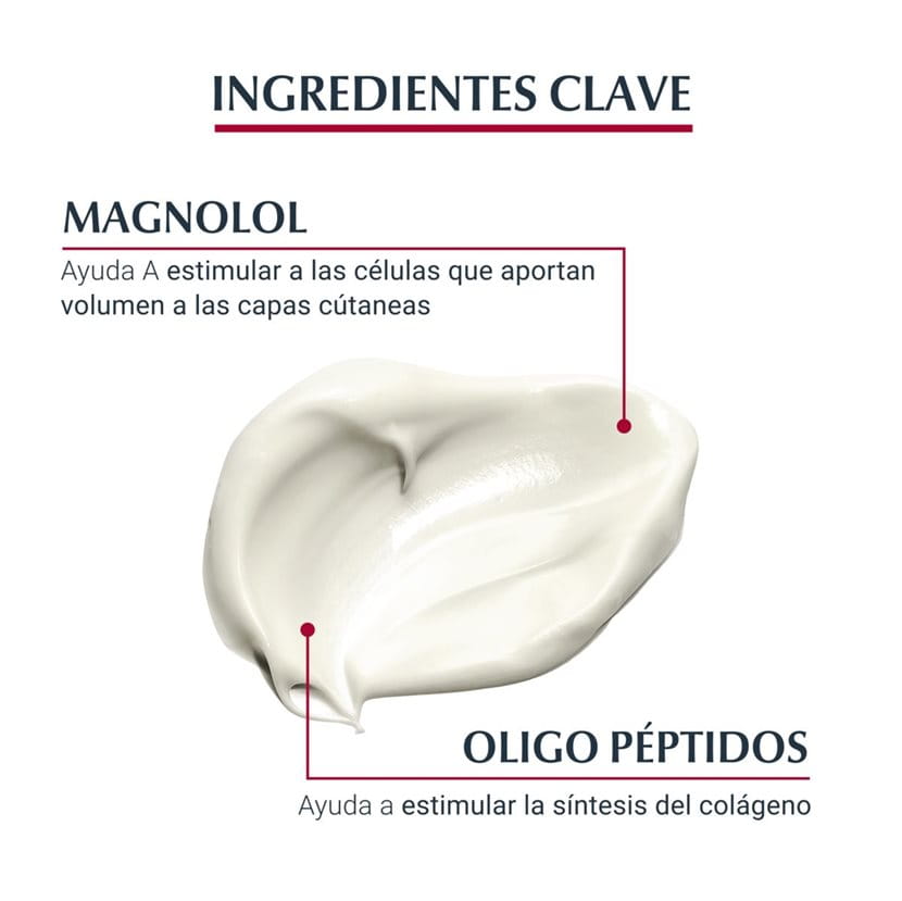 Eucerin Hyaluron-Filler Volume Lift Crema de Día para piel normal a mixta contiene tres ingredientes activos que actúan en las capas específicas de la piel para abordar los factores responsables de la piel floja, de los contornos del rostro con definición débil y de la reducción del volumen de la piel. El Extracto de Magnolia natural aumenta el tamaño y el número de las células que estimulan el volumen*. Luego, los Oligo-Péptidos que derivan del Anís refuerzan el sistema de colágeno y mejoran su renovación*. Por último, el Ácido Hialurónico también mejora los niveles de retención de humedad para rellenar la superficie de la piel y reducir las arrugas.