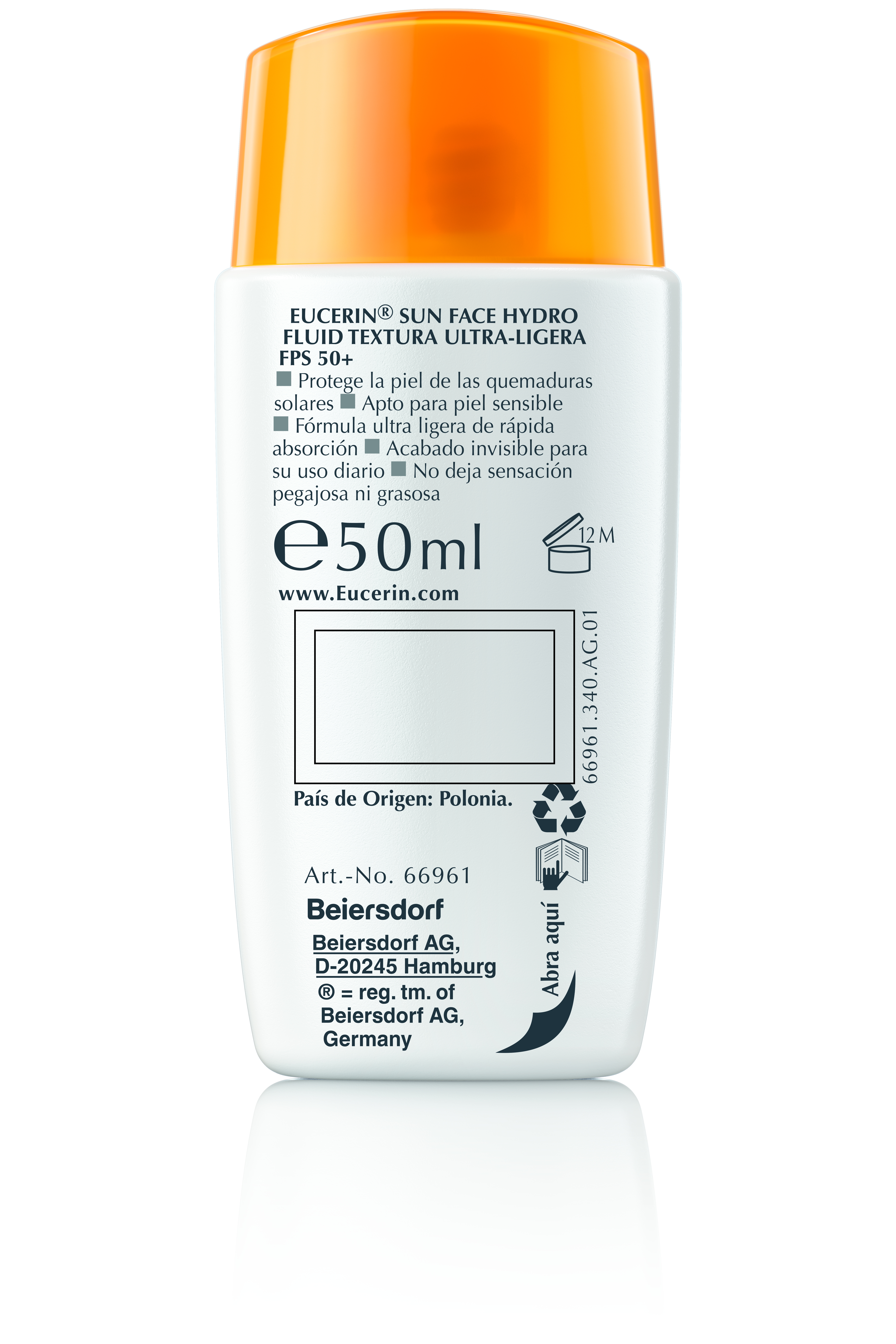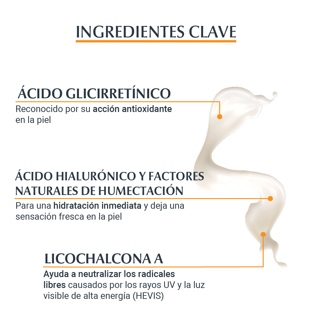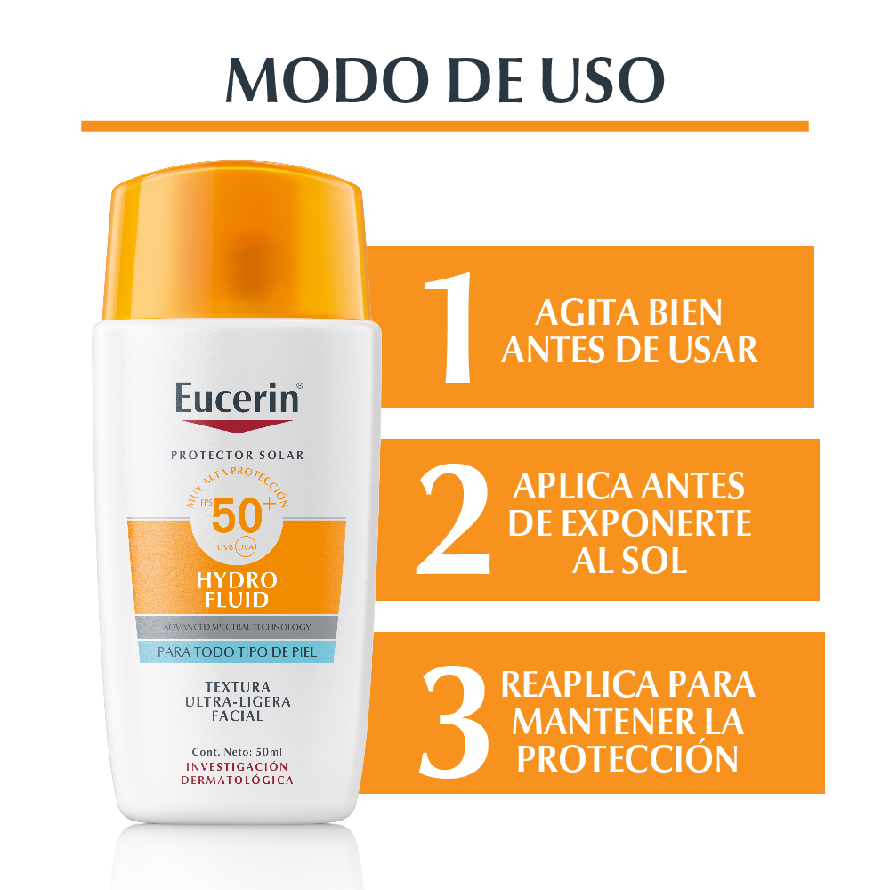 El Protector solar facial Eucerin Hydro Fluid en crema es un fluido de textura ultraligera y de rápida absorción que humecta la piel. Su fórmula combina tres ingredientes: Ácido Hialurónico, brinda una hidratación inmediata y deja una sensación fresca en la piel; Licochalcona A, protege la piel de los rayos UVA; y Ácido Glicirretínico, reconocido por su acción antioxidante y de reparación de la piel. No deja una sensación pegajosa ni grasosa y es apto para todo tipo de piel.