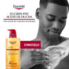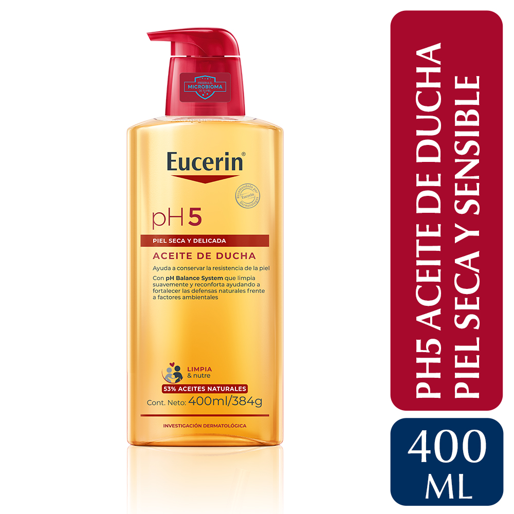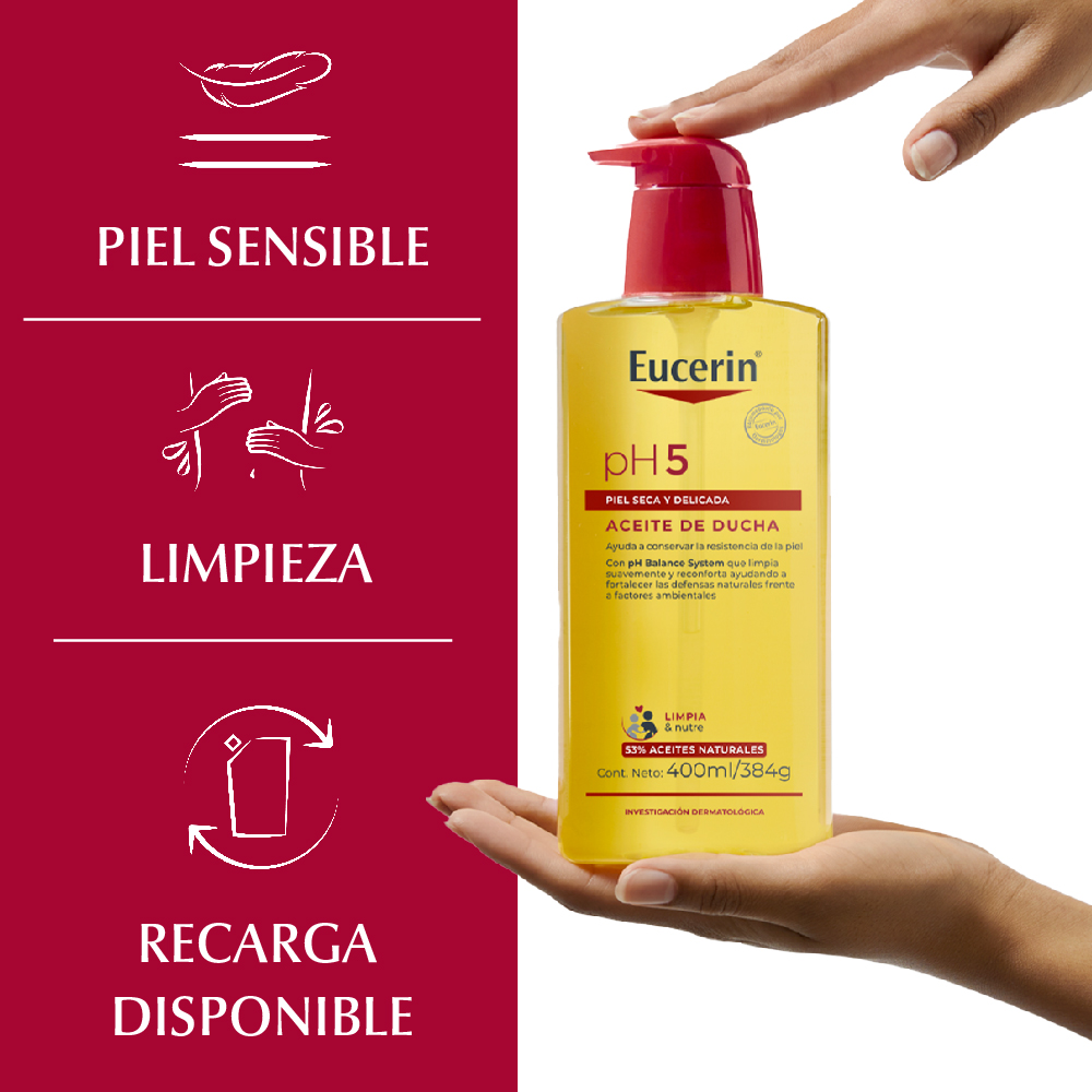 El Aceite de Ducha pH5 Eucerin de uso diario preserva las defensas naturales de la piel y previene su sequedad, incluso después de la ducha. Su fórmula contiene una formulación única de buffer citrato pH5 y surfactantes extra suaves que protegen las enzimas propias de la piel. La reposición intensiva de los lípidos deja la piel con una sensación suave y sedosa. Está probado en pieles secas y sensibles, ideal para utilizarse en zonas afectadas por alergias.