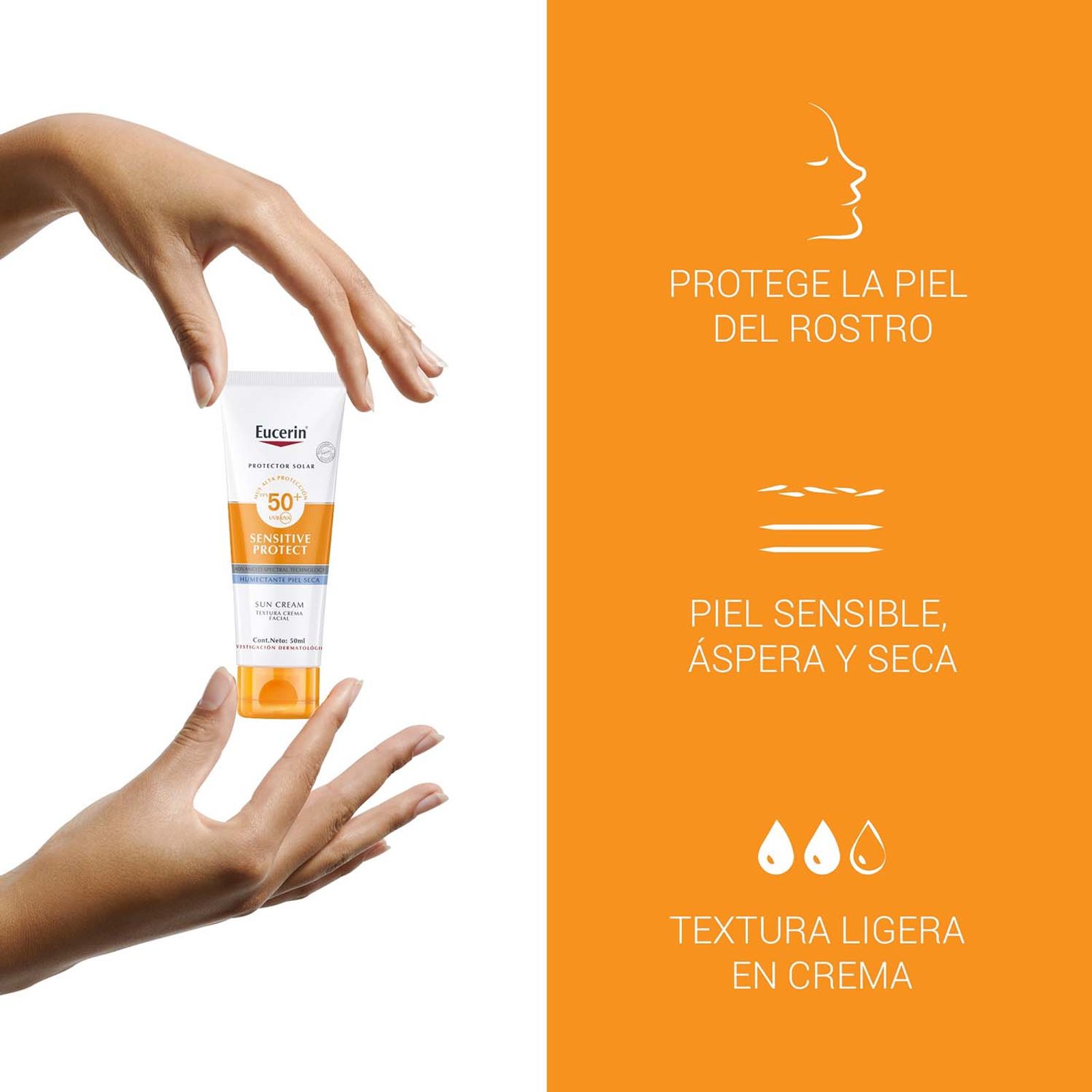 El Protector solar facial Eucerin Sensitive Protect es perfecto para uso diario ya que protege y calma la piel sensible. Su fórmula con Licochalcona A y Ácido Glicirretínico, ingredientes que ayudan a neutralizar los radicales libres y favorece la reparación de la piel. Tiene una textura ligera y cremosa, está clínica y dermatológicamente probado. Contiene Fps 50+ y es adecuado para la piel sensible y seca.