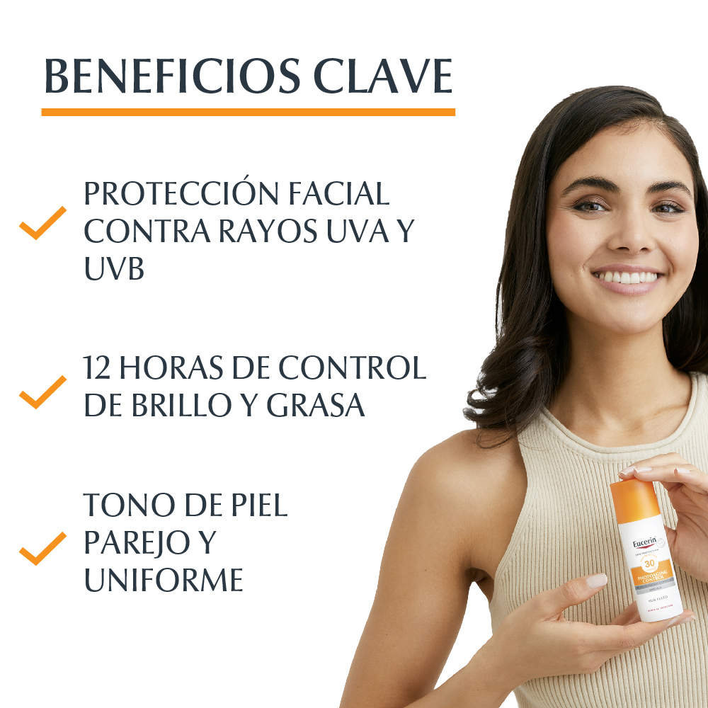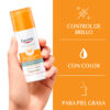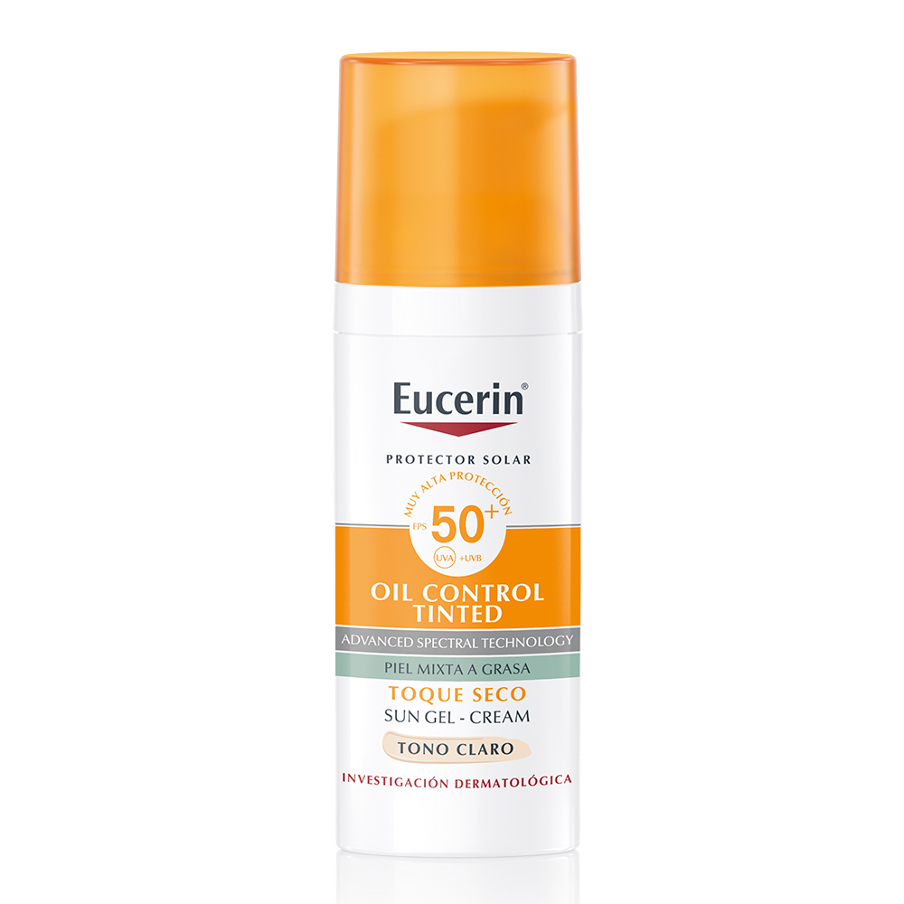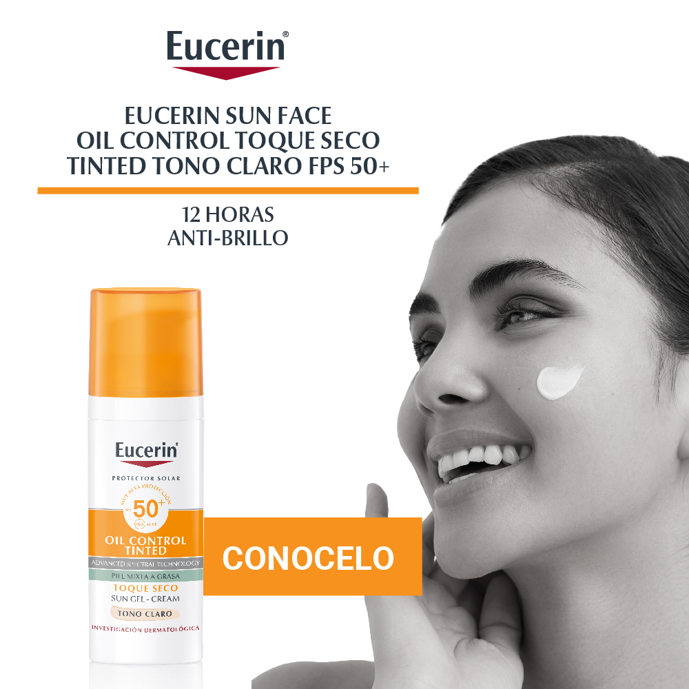 El Protector solar Eucerin Oil Control Sun Face Toque Seco con Advanced Spetral Technology está diseñado para las necesidades específicas de la piel grasa y propensa al acné. Esta crema para el rostro proporciona protección de nivel superior contra los daños de la piel incluidos por el sol, ayuda a prevenir el fotoenvejecimiento y contiene una solución activa para mejorar el estado de la piel. Su fórmula contiene Licochalcona A, Ácido Glicirretínico y Carnitina para darle a la piel un acabado mate seco, inmediato y duradero por doce horas, protegiéndola del sol. Además, posee un sistema de filtros solares UVA/UVB fotoestable, FPS 50 y pigmentos de color que favorecen a un tono de piel más uniforme y homogéneo, pudiendo elegir entre un tono claro o medio.