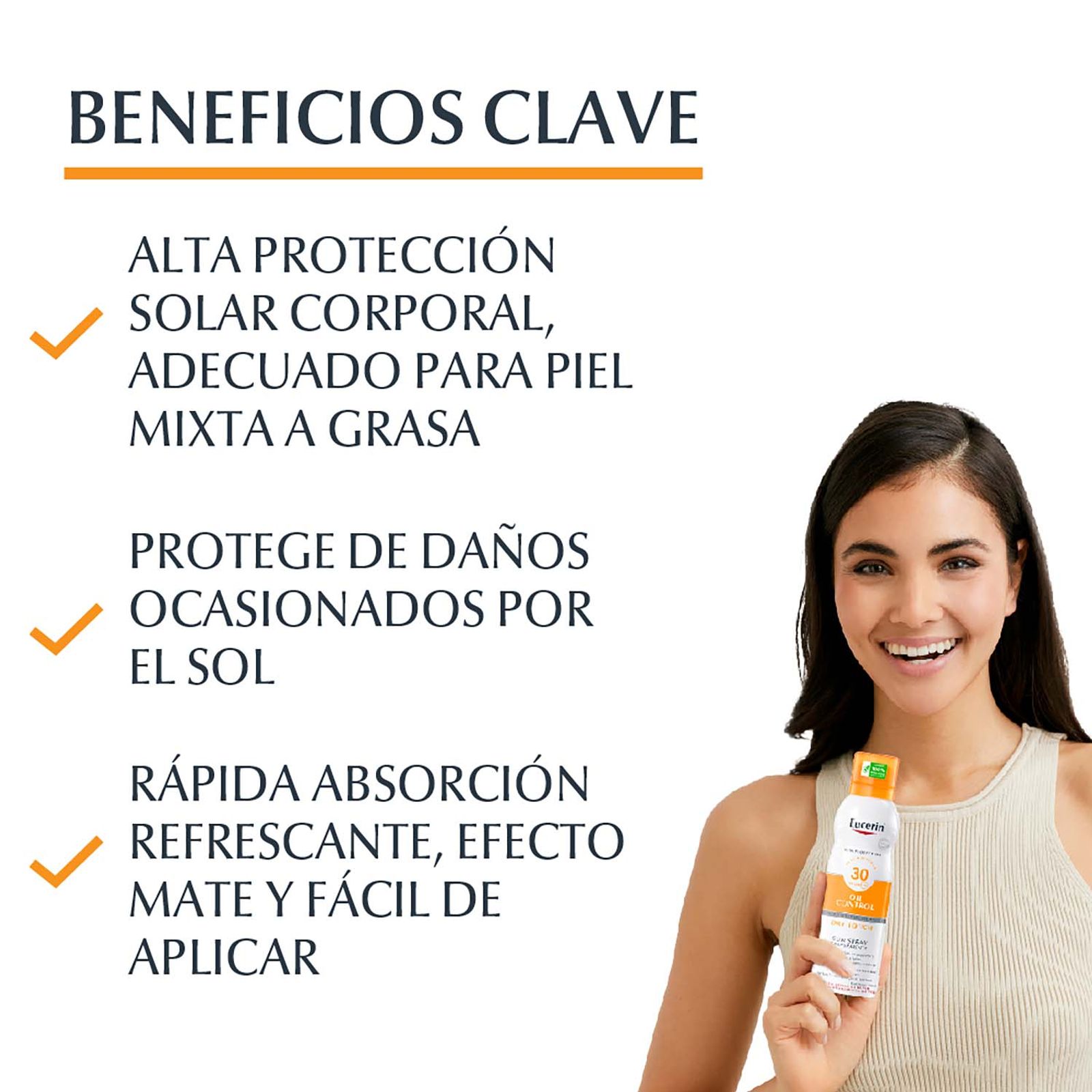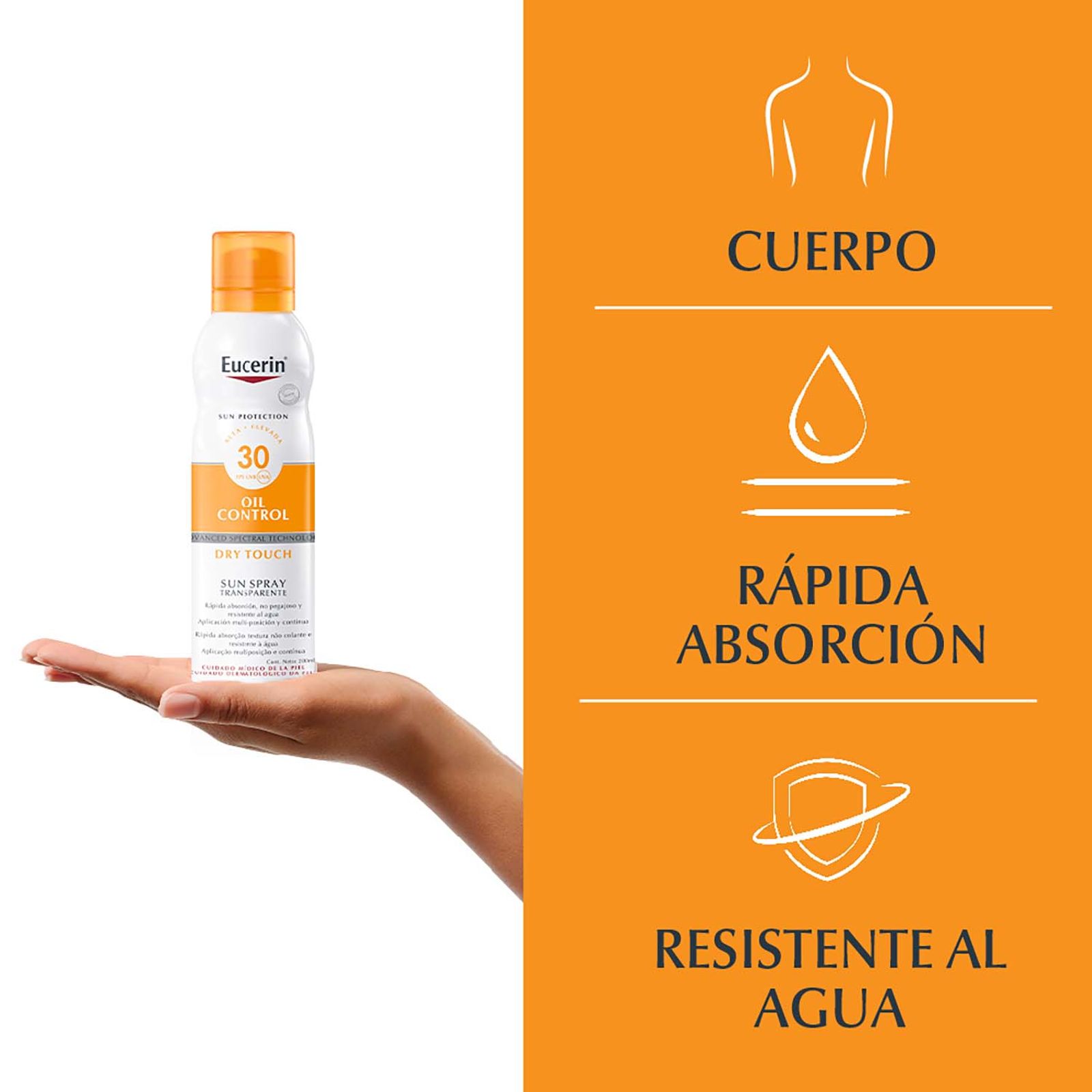 El Protector solar corporal en spray Eucerin Toque Seco se ha diseñado especialmente para pieles sensibles o pieles propensas al acné. Es un spray 100% transparente y de textura ligera se absorbe rápidamente y produce un efecto refrescante. Su fórmula contiene Licochalcona A, un potente antioxidante que protege las células de la piel contra los daños en la piel inducidos por el sol. También posee FPS 30 y un sistema de filtros UVA/UVB que brinda un cuidado confiable contra las quemaduras solares. Su presentación en aerosol de 100% aluminio reciclado permite aplicarlo rápidamente, de forma homogénea y desde varias posiciones.