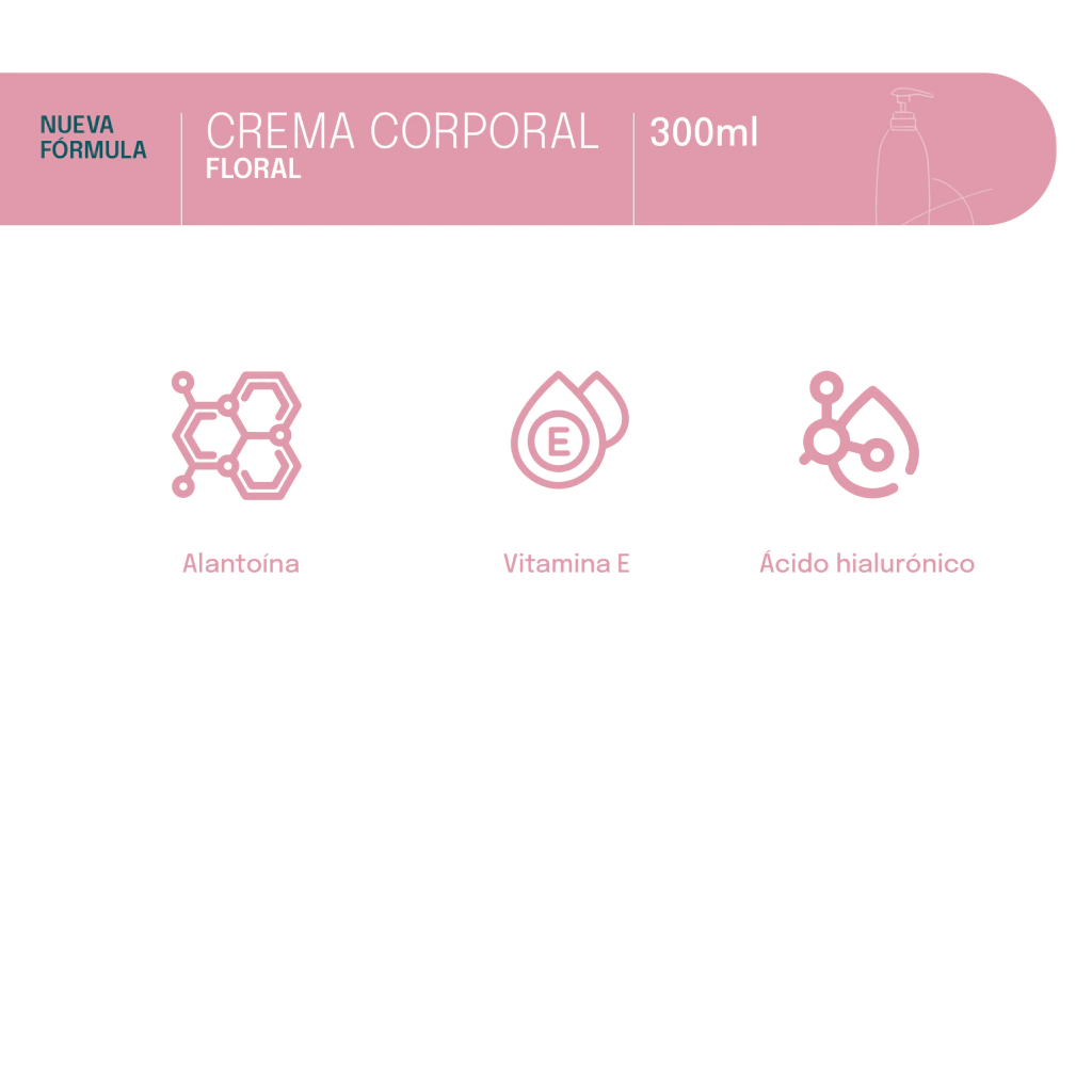 La crema corporal floral es altamente hidratante, dejando la piel suave y sutilmente perfumada con aroma floral. Su fórmula contiene ácido hialurónico, alantoína, vitamina E, extracto de oliva y pepita de uva, que aportan hidratación, regeneración y anti-oxidación a la piel. Tiene una textura ultraligera y rápida absorción. Es libre de colorantes y sulfatos.