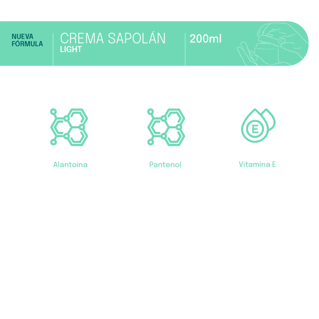 La nueva crema sapolán light tiene una textura más ligera, pero los mismos beneficios que la sapolán tradicional: hidratar y proteger la piel. Su fórmula contiene alantoína, pantenol y vitamina E, además de extracto de oliva y pepita de uva. Ayuda a prevenir las estrías y a combatir el resquebrajamiento de la piel. Es una crema ideal para uso diario en pieles secas.