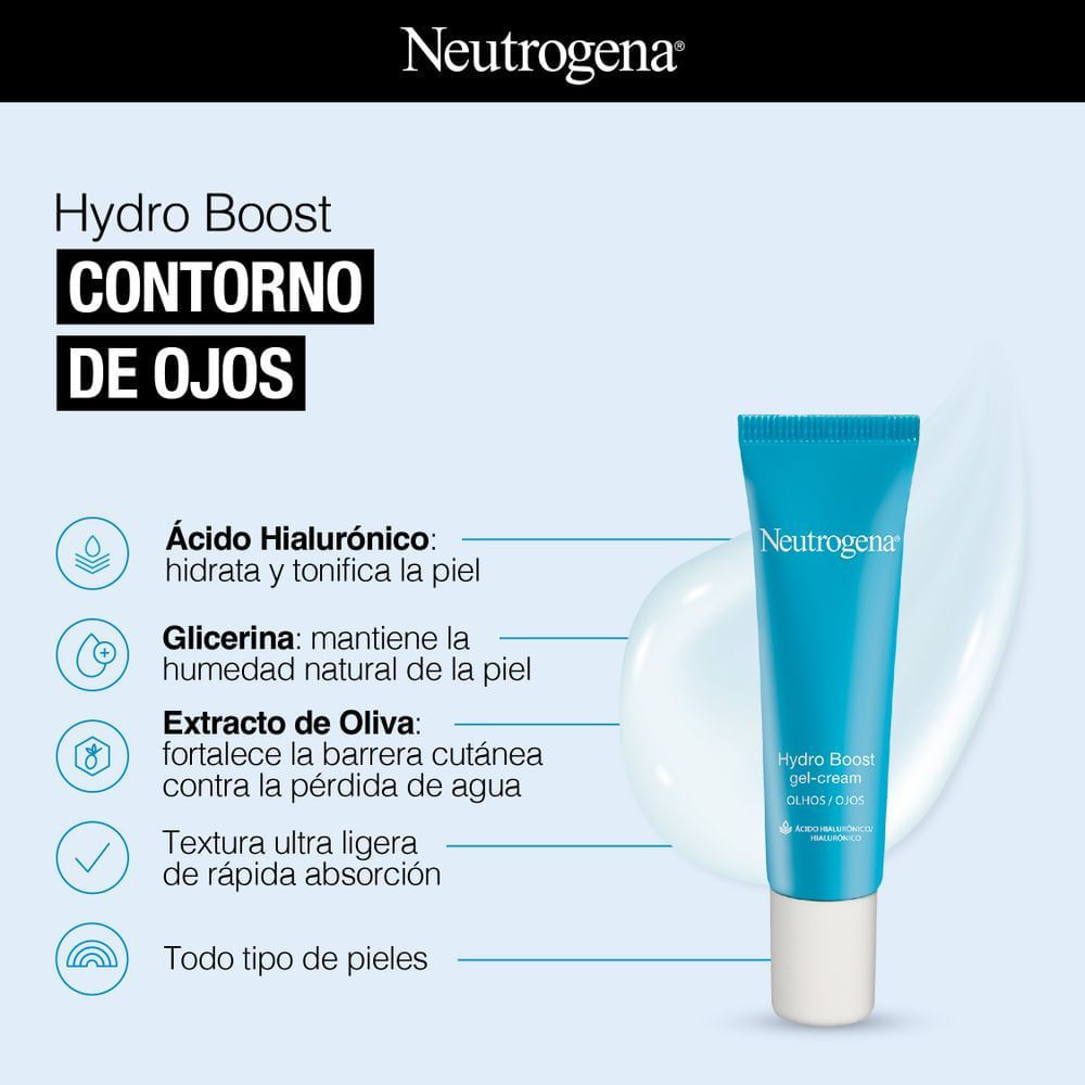 La crema hidratante de ojos NEUTROGENA HYDRO BOOST Gel-Crema reestablece los niveles saludables de agua de la piel, renueva, revitaliza e hidrata el área de los ojos por 48hs. Su fórmula Gel Matrix con ácido hialurónico, Glicerina y extracto de oliva se caracteriza por la textura ultraliviana, no grasosa y de rápida absorción.