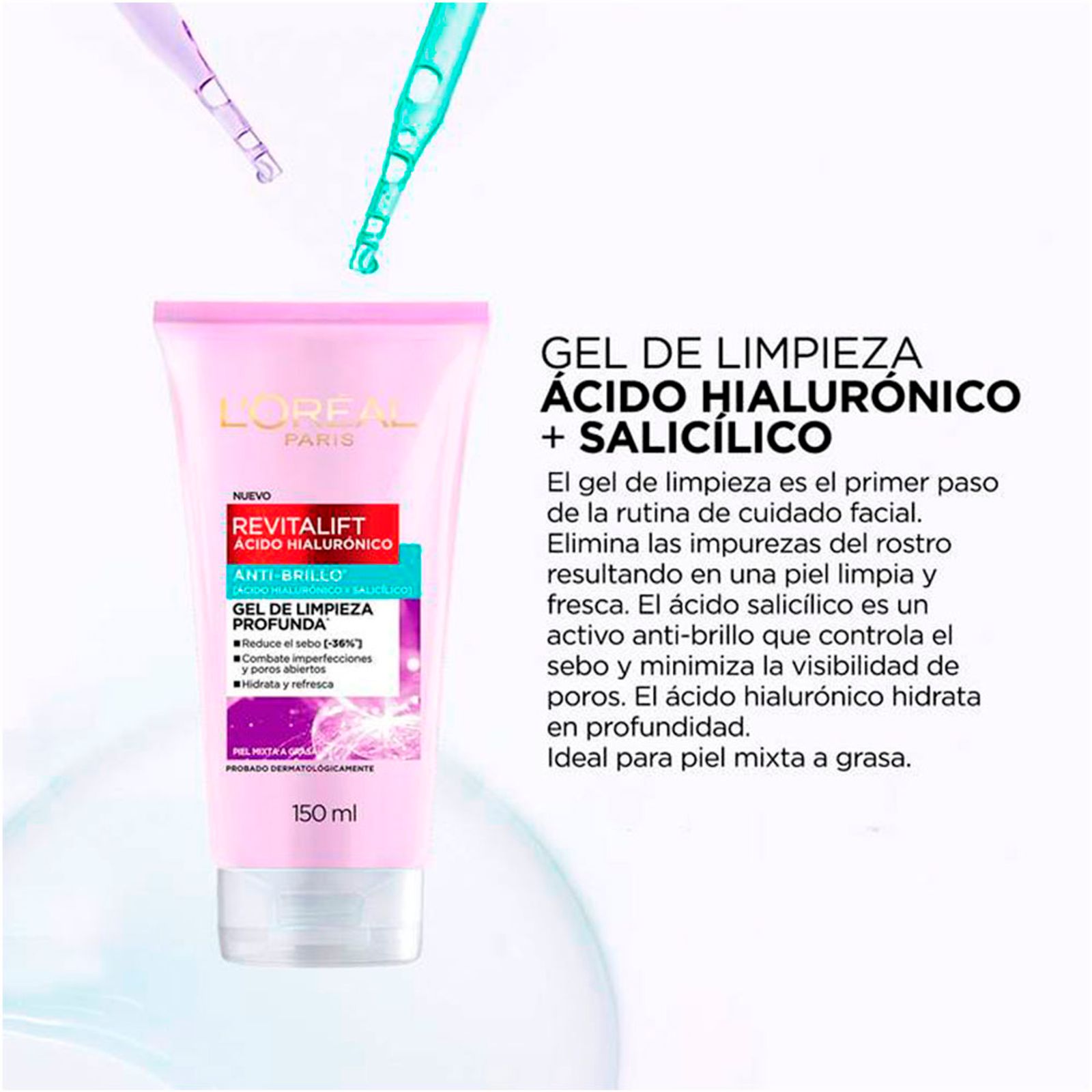 El Gel de Limpieza Revitalift de Ácido Hialurónico y Ácido Salícilico constituye el primer y fundamental paso en la rutina de cuidado facial. Elimina las impurezas del rostro sin resecar, resultando en una piel limpia y fresca. El ácido salicílico controla el sebo, minimiza la visibilidad de los poros y mantiene la piel sin brillo. Además, gracias a su contenido de ácido hialurónico, limpia la piel sin resecar.