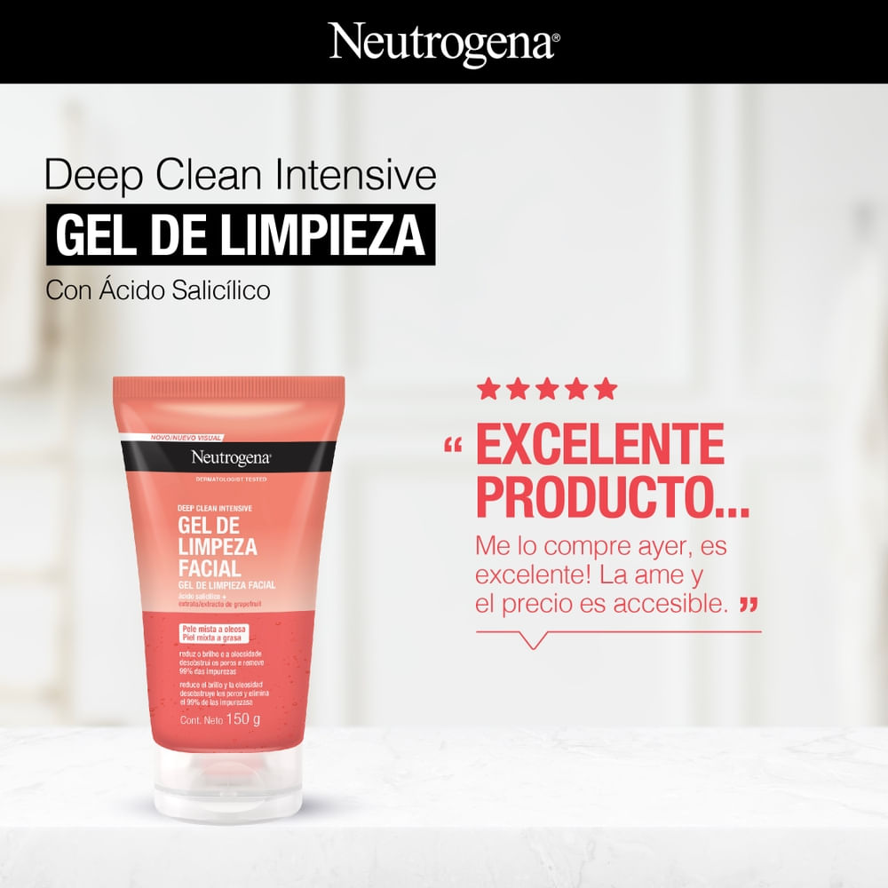 El gel de limpieza facial NEUTROGENA Deep Clean Intensive Grapefruit de uso diario combina el activo Beta-Hidróxido y el extracto natural de pomelo para limpiar en profundidad los poros y eliminar el 99% de la oleosidad y las impurezas, dejando la piel ultralimpia y fresca cada día.