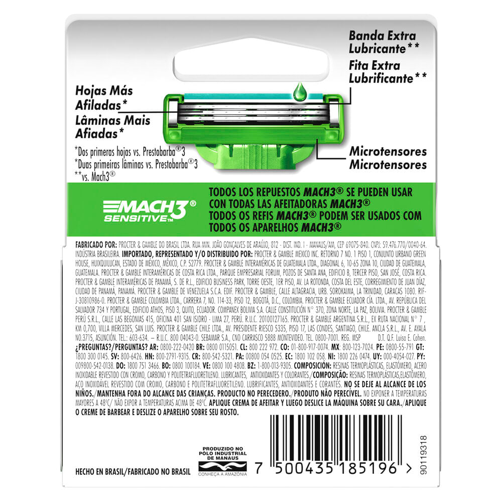 Los repuestos para la máquina de afeitar Gillette Mach3 Sensitive para pieles sensibles cuentan con una banda extra lubricante con Aloe Vera y Vitamina E, que ayuda a proteger tu piel de la irritación. Con 3 hojas más fuertes que el acero, que se mantienen afiladas por más tiempo* (*vs. Prestobarba3), te brindan hasta 20 afeitadas por repuesto. Además, cuentan con una cabeza flexible que se ajusta al contorno de tu cara y 10 microtensores que alisan la piel para brindarte una afeitada más al ras. Todos los cartuchos de la familia MACH3 se pueden usar con cualquier mango MACH3.
