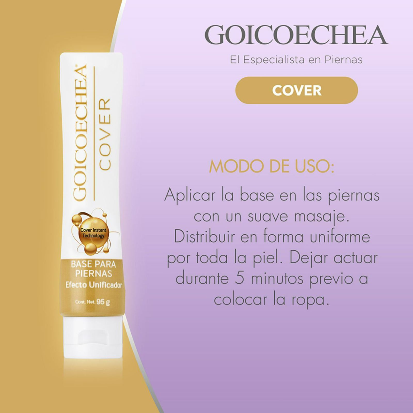 Goicoechea cover, base para piernas que hidrata la piel unificando el tono y disimula las imperfecciones BENEFICIOS – BASE: Base para piernas – HIDRATA: Hidrata la piel – FÓRMULA: Posee una innovadora fórmula con agentes que hidratan la piel – UNIFICADOR: Efecto Unificador y disimula imperfecciones MODO DE USO Aplicar la base en las piernas con un suave masaje. Distribuir en forma uniforme por toda la piel. Dejar actuar durante 5 minutos previo a colocar la ropa