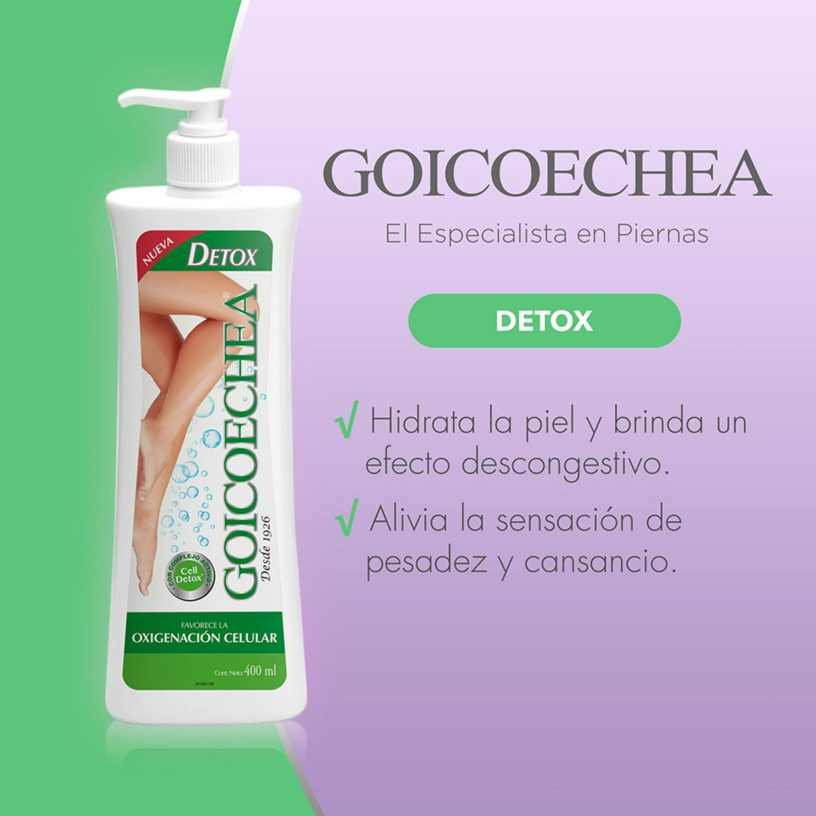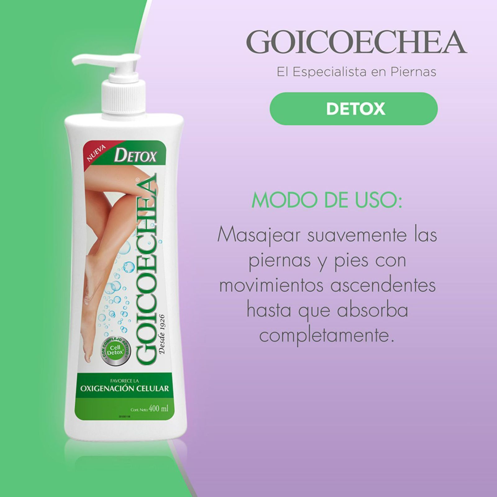 crema Detox contiene un exclusivo complejo activo Cell Detox, que favorece la oxigenación celular. Hidrata la piel y brinda un efecto descongestivo. Aliviando la sensación de pesadez y cansancio BENEFICIOS – ACCIÓN: Hidrata la piel y brinda un efecto descongestivo – ALIVIO: Alivia la sensación de pesadez y cansancio – FÓRMULA: Su complejo activo Cell Detox aumenta la disponibilidad de oxígeno en la piel mejorando la oxigenación de las células – RESULTADO: Tus piernas se sienten suaves, revitalizadas y descongestionadas MODO DE USO: Masajear suavemente las piernas y pies con movimientos ascendentes hasta que absorba completamente.