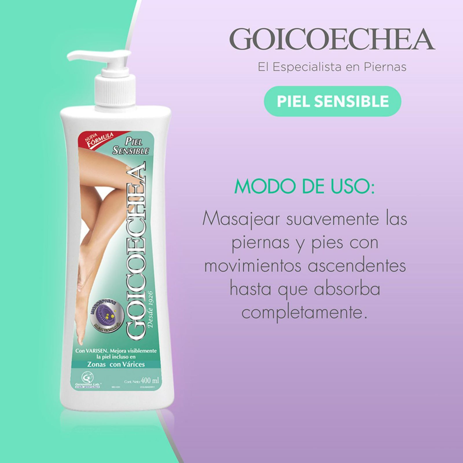 Piel Sensible es una crema con ingredientes que humectan y protegen la piel sensible. Su fórmula con pepino y manzanilla protege la piel de los daños causados por la rutina diaria. Su fórmula humecta la piel dejándola suave y protegida BENEFICIOS – ACCIÓN: Mejora el aspecto de la piel incluso en zonas con várices – ALIVIO: Su fórmula con mentol brinda una sensación de alivio a las piernas cansadas y pesadas – FÓRMULA: Su fórmula contiene dos extractos de origen natural con las siguientes propiedades: castaño de indias que ayuda a aliviar la sensación de pesadez de las piernas y centella asiática que brinda una sensación de alivio y relajación a las piernas. – RESULTADO: La piel queda más lisa y mejora visiblemente aún en zonas con várices. Las piernas quedan relajadas y descansadas MODO DE USO: Masajear suavemente las piernas y pies con movimientos ascendentes hasta que absorba completamente.