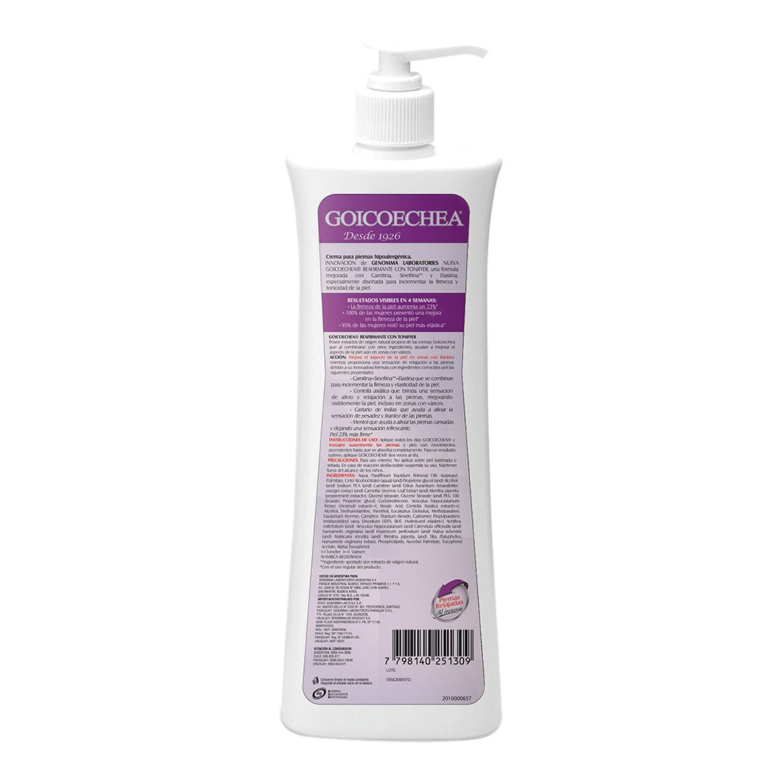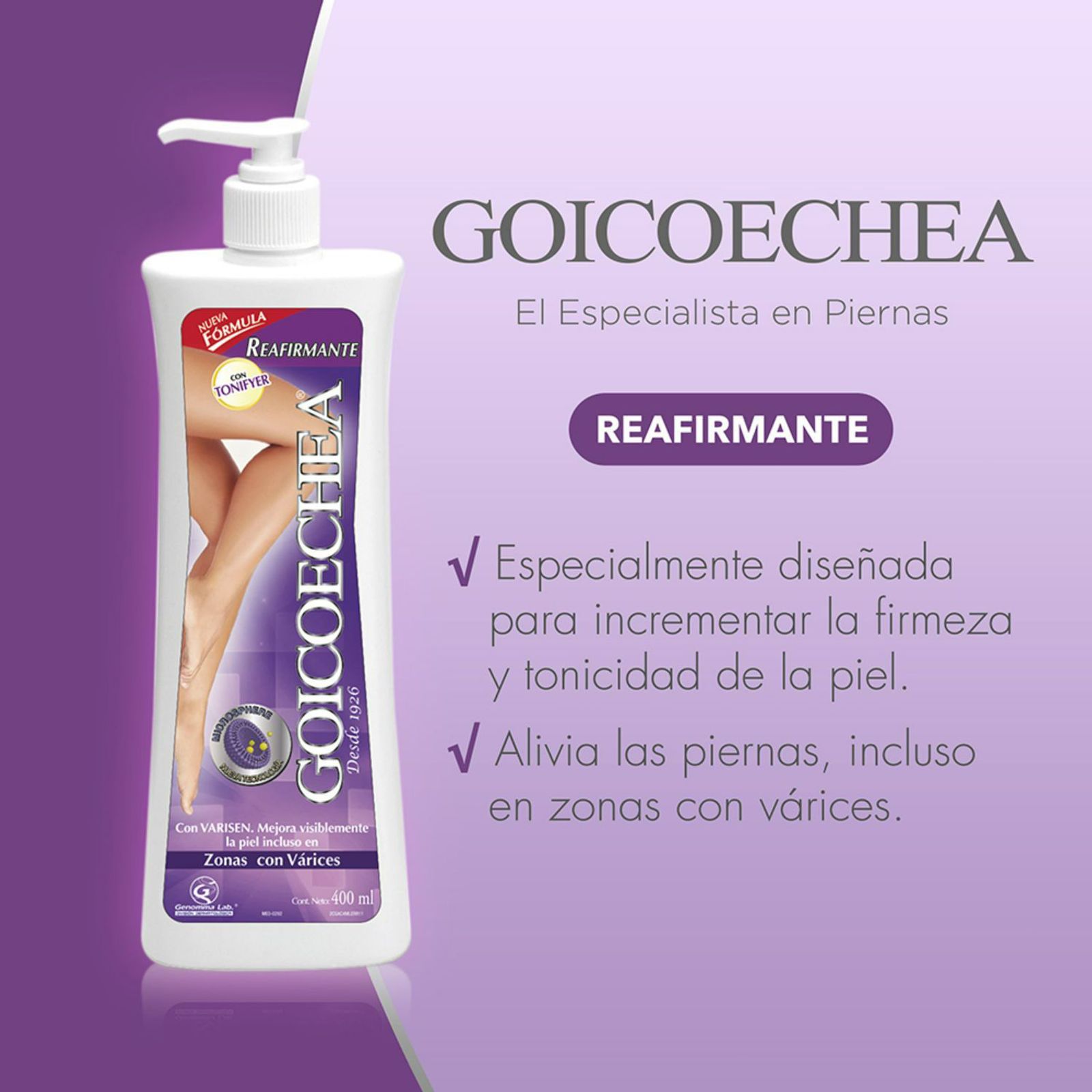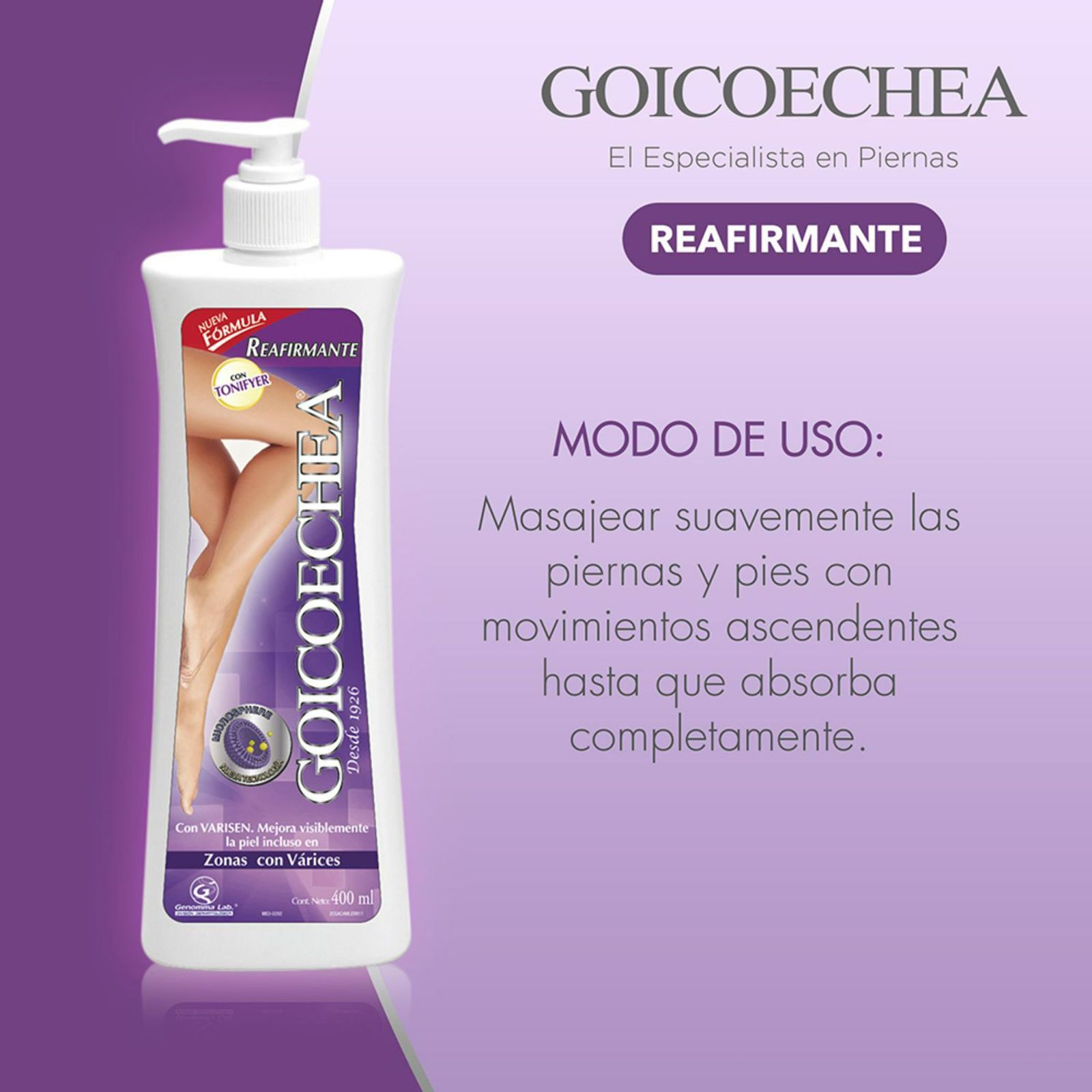 Goicoechea Reafirmante con Tonifyer fórmula mejorada con Carnitina Sinefrina y Elastina especialmente diseñada para incrementar la firmeza y elasticidad de la piel. BENEFICIOS – FIRMEZA: Especialmente diseñada para incrementar la firmeza y tonicidad de la piel. – ALIVIO: Alivia las piernas incluso en zonas con várices – FÓRMULA: Su fórmula mejorada con Carnitina Sinefrina y Elastina – ACCIÓN: Mejora el aspecto de la piel en zonas con flacidez y várices, mientras relaja las piernas MODO DE USO Masajear suavemente las piernas y pies con movimientos ascendentes hasta que absorba completamente.