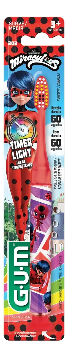 El cepillo con luz Miraculous Ladybug de GUM® tiene luces LED que iluminan todo el cepillo y se encienden durante 60 segundos para animar a los niños a cepillarse los dientes durante más tiempo. El tiempo recomendado por los dentistas para el cepillado es de 1 minuto para cada maxilar.