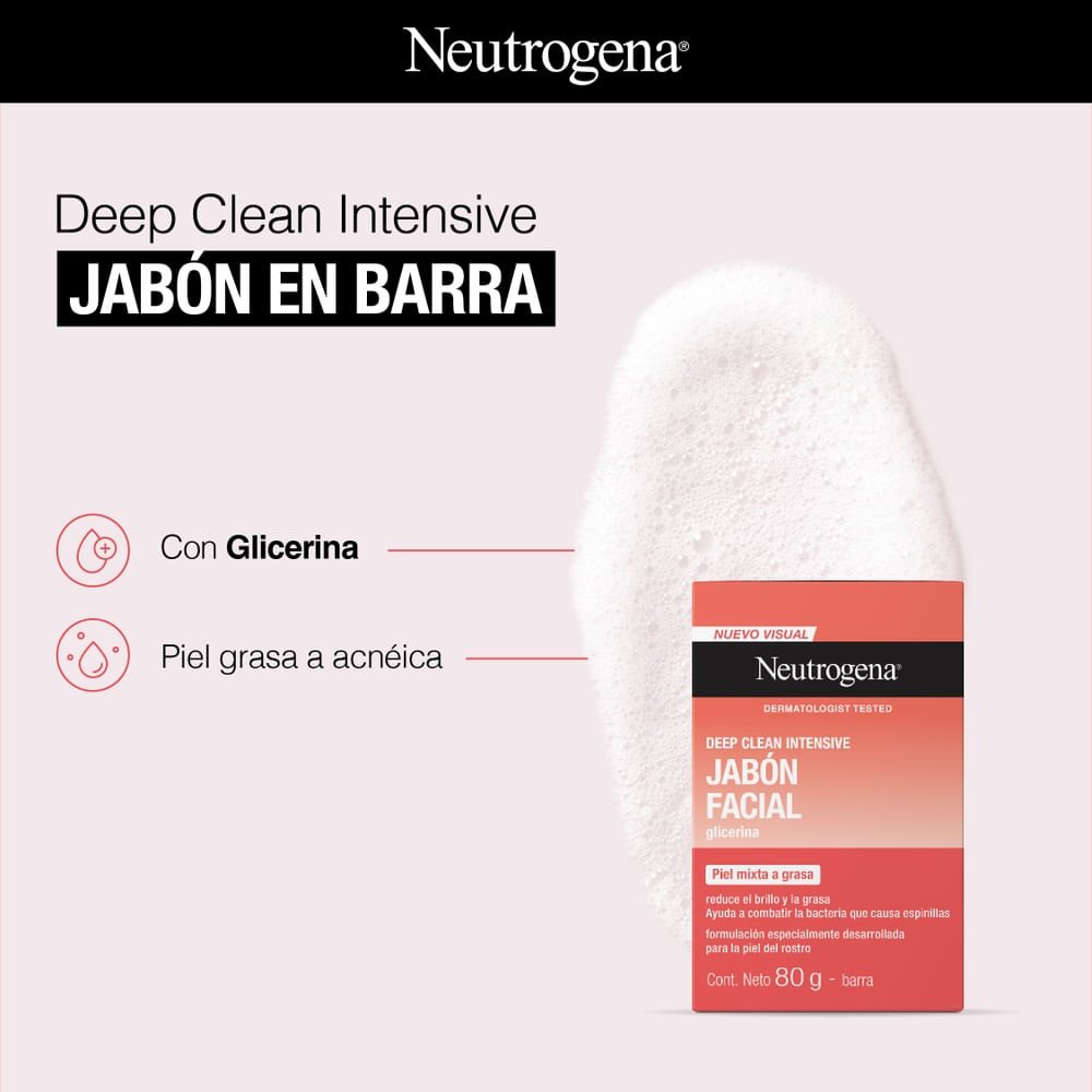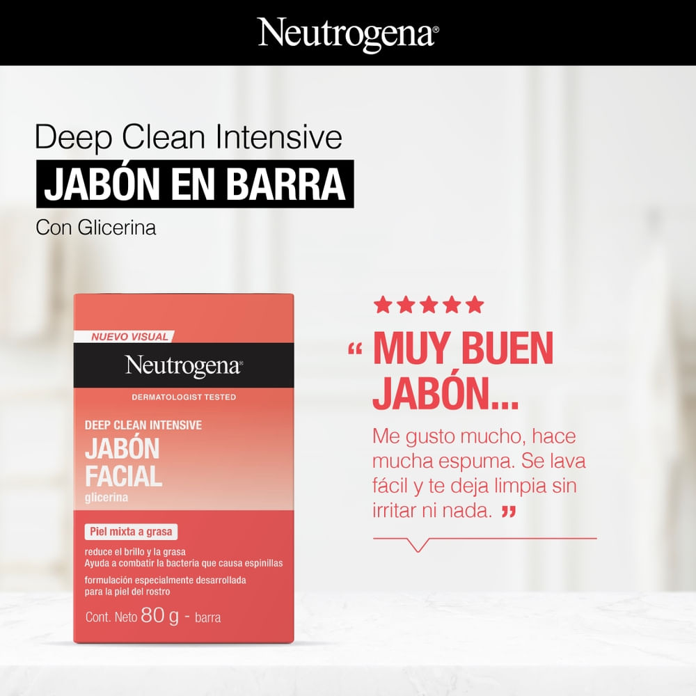 La barra de limpieza facial NEUTROGENA® DEEP CLEAN® limpia profundamente los poros, ayudando a eliminar la oleosidad y las impurezas de la piel. Su fórmula rica en glicerina ayuda a combatir las bacterias causantes de barritos (espinillas). Con una nueva formulación, aún más suave, deja la piel libre de oleosidad y por eso más limpia, linda y saludable. Indicado para uso diario.