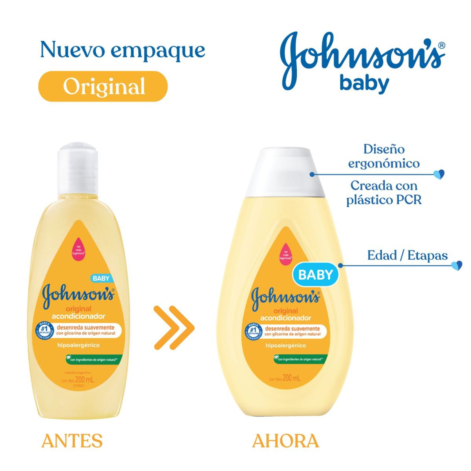 Marca #1 del mundo en cuidado de bebes y niños*. Nosotros cuidamos de los bebés desde hace más de 125 años y siempre estamos evolucionando, buscando perfeccionar nuestras fórmulas. Ahora son más suaves para brindar el cuidado que el cabello del bebé necesita. La línea JOHNSON’S Original deja el delicado cabello del bebé suave, sedoso y protegido**. Tiene pH fisiológico, es hipoalergénico y es libre de colorantes, parabenos, sulfatos e ftalatos. Con ingredientes de origen natural*** Los productos JOHNSON?S son desarrollados para cumplir con los más altos estándares de seguridad de ingredientes. *Euromonitor International limited; Belleza y Cuidado personal, edición 2021, productos de cuidado del bebé y niño, todos los canales de distribución, valor de ventas al consumidor, datos de 2020 **del resecamiento ***Formulado con más de 90% de ingredientes de origen natural. Calculado segun ISO 16128 basado en el volúmen acumulado incluyendo agua