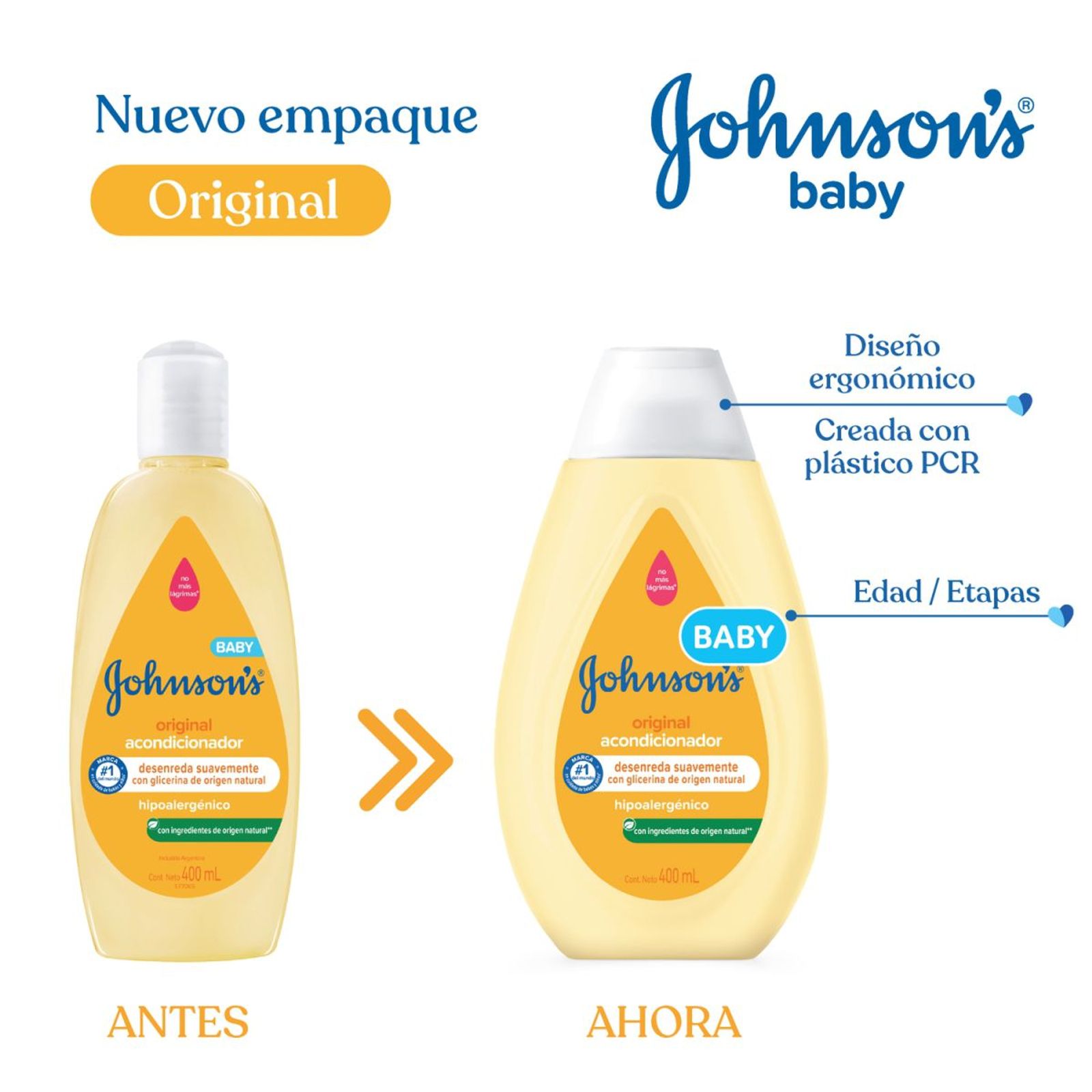 Marca #1 del mundo en cuidado de bebes y niños*. Nosotros cuidamos de los bebés desde hace más de 125 años y siempre estamos evolucionando, buscando perfeccionar nuestras fórmulas. Ahora son más suaves para brindar el cuidado que el cabello del bebé necesita. La línea JOHNSON’S Original deja el delicado cabello del bebé suave, sedoso y protegido**. Tiene pH fisiológico, es hipoalergénico y es libre de colorantes, parabenos, sulfatos e ftalatos. Con ingredientes de origen natural*** Los productos JOHNSON?S son desarrollados para cumplir con los más altos estándares de seguridad de ingredientes. *Euromonitor International limited; Belleza y Cuidado personal, edición 2021, productos de cuidado del bebé y niño, todos los canales de distribución, valor de ventas al consumidor, datos de 2020 **del resecamiento ***Formulado con más de 90% de ingredientes de origen natural. Calculado segun ISO 16128 basado en el volúmen acumulado incluyendo agua