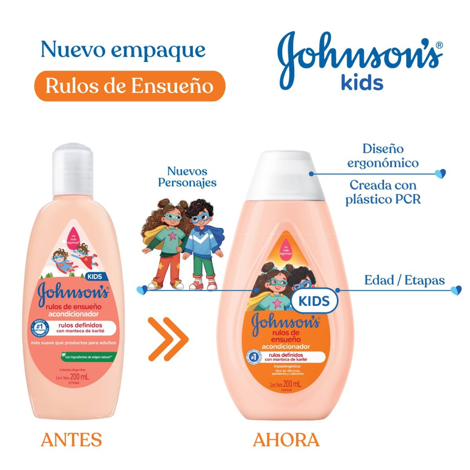 ¿Sabías qué? A medida que tu hijo crece, las necesidades de su cabello van cambiando. La línea JOHNSON?S® Rizos de Ensueño ayuda a controlar el volumen del cabello, dejándolo con rizos definidos y naturales. El Acondicionador JOHNSON’S® Rulos de Ensueño ayuda a controlar el volumen del cabello y gracias a su fórmula con manteca de karité deja los rulos definidos durante todo el día. Posee pH fisiológico, es hipoalergénico y libre de colorantes, parabenos, sulfatos y ftalatos. Para mejores resultados combinar con el Shampoo de la línea. Debe ser aplicado por un adulto o bajo la supervisión de uno. No utilizar en caso de que el cuero cabelludo presente irritaciones. Adecuado para su uso diario.