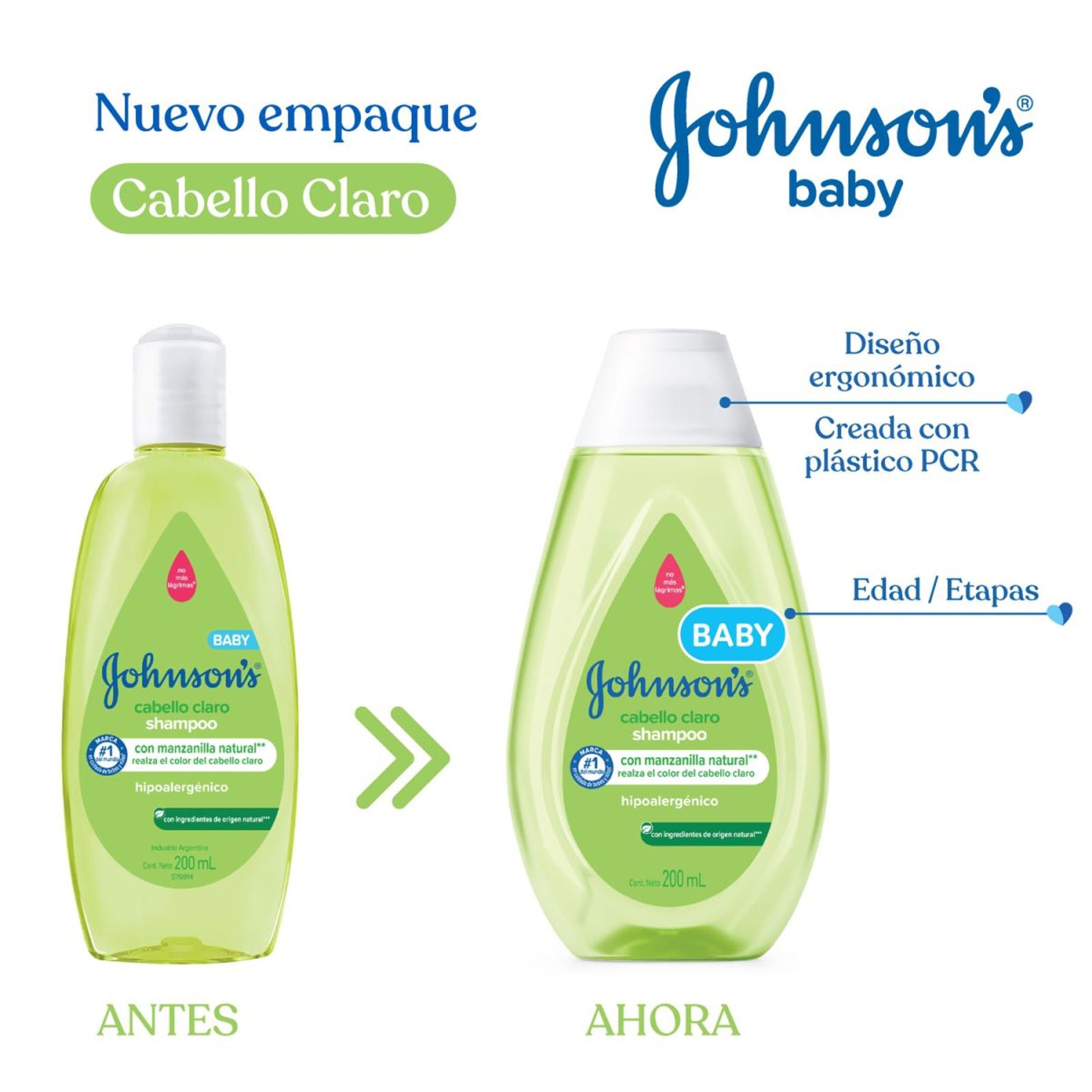 Marca #1 del mundo en cuidado de bebes y niños*. Nosotros cuidamos de los bebés desde hace más de 125 años y siempre estamos evolucionando, buscando perfeccionar nuestras fórmulas. Ahora son más suaves para brindar el cuidado que el cabello del bebé necesita. La línea Cabello Claro contiene manzanilla natural** que realza el color del cabello de tu bebé. Tiene pH fisiológico, es hipoalergénico y es libre de colorantes, parabenos, sulfatos e ftalatos. Los productos JOHNSON?S son desarrollados para cumplir con los más altos estándares de seguridad de ingredientes. *Euromonitor International limited; Belleza y Cuidado personal, edición 2021, productos de cuidado del bebé y niño, todos los canales de distribución, valor de ventas al consumidor, datos de 2020 **fragancia con extracto de manzanilla.
