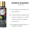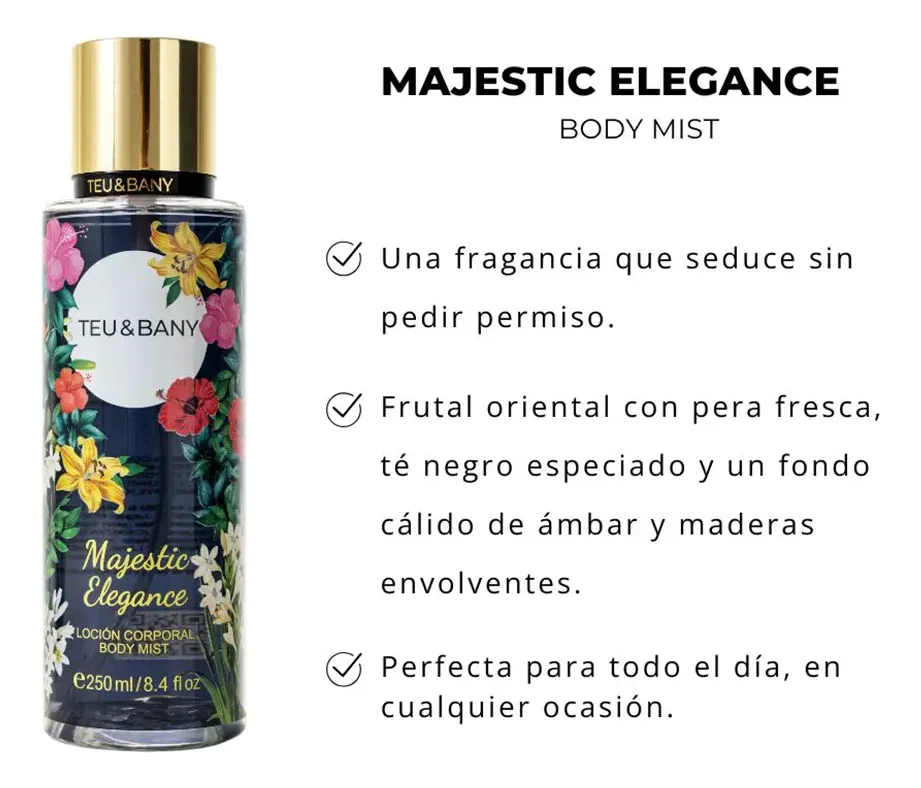 La dulzura con un giro inesperado. Un aroma cautivante que combina la frescura y misterio. A primera impresión, su esencia es dulce y fresca, pero en su interior esconde una intensidad arrolladora. No es una fragancia ingenua, sino el equilibrio perfecto entre delicadeza y audacia, como una femme fatale disfrazada de inocencia. Majestic Elegance: Es una fragancia dulce y especiada, con una mezcla inusual pero armoniosa entre la frescura de la fruta y las notas cálidas y especiadas, creando una sensación audaz y seductora.