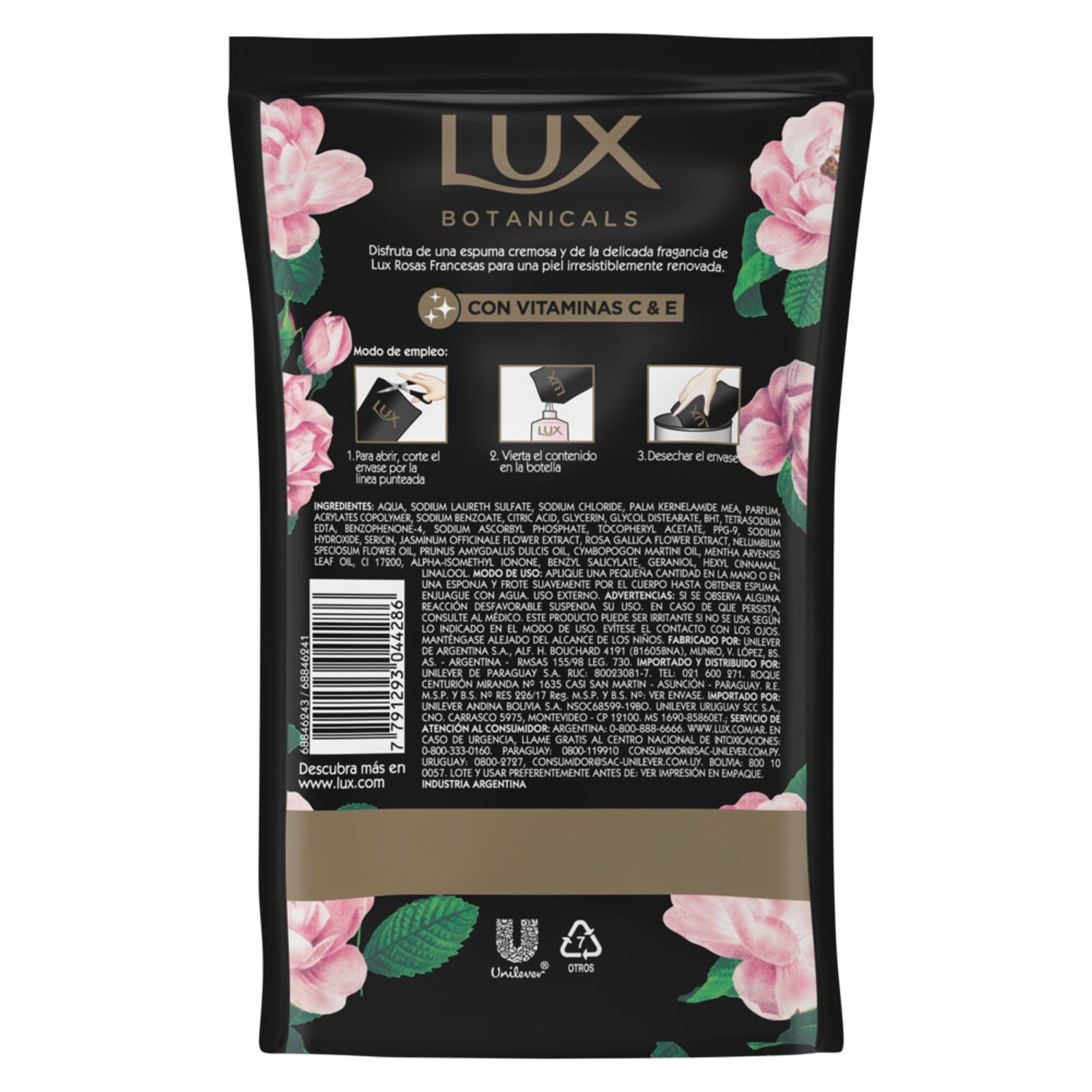 Disfrutá la fragancia y frescura de Lux Rosas Francesas para una piel irresistiblemente más luminosa. El jabón líquido Lux Rosas Francesas es la solución para una piel suave y con fragancia exquisita. Hidrata profundamente, dejando la piel radiante y suavemente perfumada. Probá el nuevo Lux, su fórmula sin parabenos combina exclusivas fragancias y aceites hidraflorales extraídos de la naturaleza para darte una nueva sensación para tu piel. Además, de estar inspiradas en la naturaleza, las fragancias del jabón líquido para manos Lux posee una combinación única de ingredientes botánicos naturales para transformar la ducha en un momento único, especial y relajante. Su nueva tecnología exclusiva contiene aceites más puros y sustentables en su base.El resultado de esta increíble combinación son fragancias hasta dos veces más intensas comparadas con la tecnología anterior de Lux.