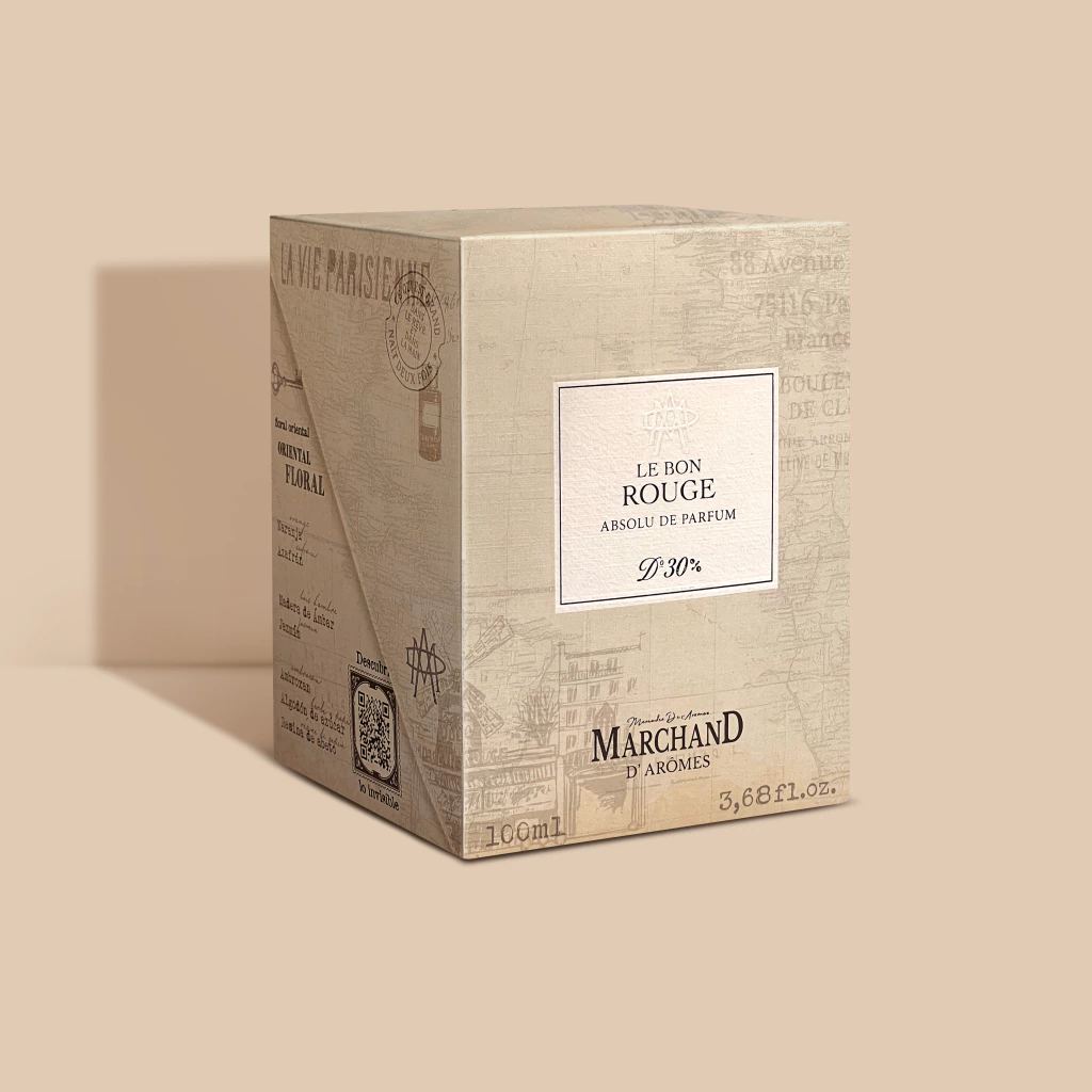 Absolu de Parfum es la expresión más elevada de la perfumería de Marchand d’Arômes. Cada creación está elaborada con esencias francesas de la histórica casa Robertet, ubicada en Grasse —cuna del perfume mundial—, reconocida por su dominio en materias primas naturales. Con una concentración excepcional de entre 25% y 30%, y 100 ml cada fragancia revela una intensidad profunda y una permanencia extraordinaria. Su frasco de cristal ámbar importado protege la pureza de las esencias y está intervenido con delicados grabados de la marca, mientras su tapa imantada y su actuador long-lasting garantizan una experiencia de uso impecable. Cada perfume se presenta en un estuche rígido imantado, concebido como una pieza de colección que guarda la historia detrás de cada aroma, con un QR interactivo que invita a descubrir su universo sensorial: playlists, videos, relatos y acceso directo a la experiencia digital de la marca. La dosificación de esencia, certificada por escribano, asegura transparencia y autenticidad en cada frasco, y cada estuche se entrega dentro de una bolsa individual de diseño exclusivo, confeccionada con materiales de altísima calidad, pensada para realzar la experiencia del lujo contemporáneo.