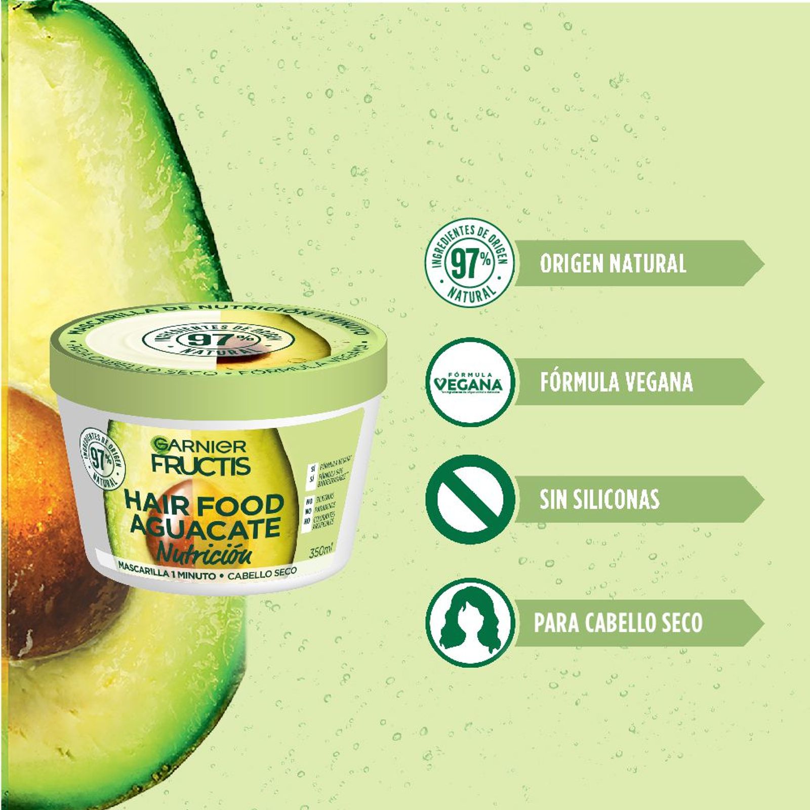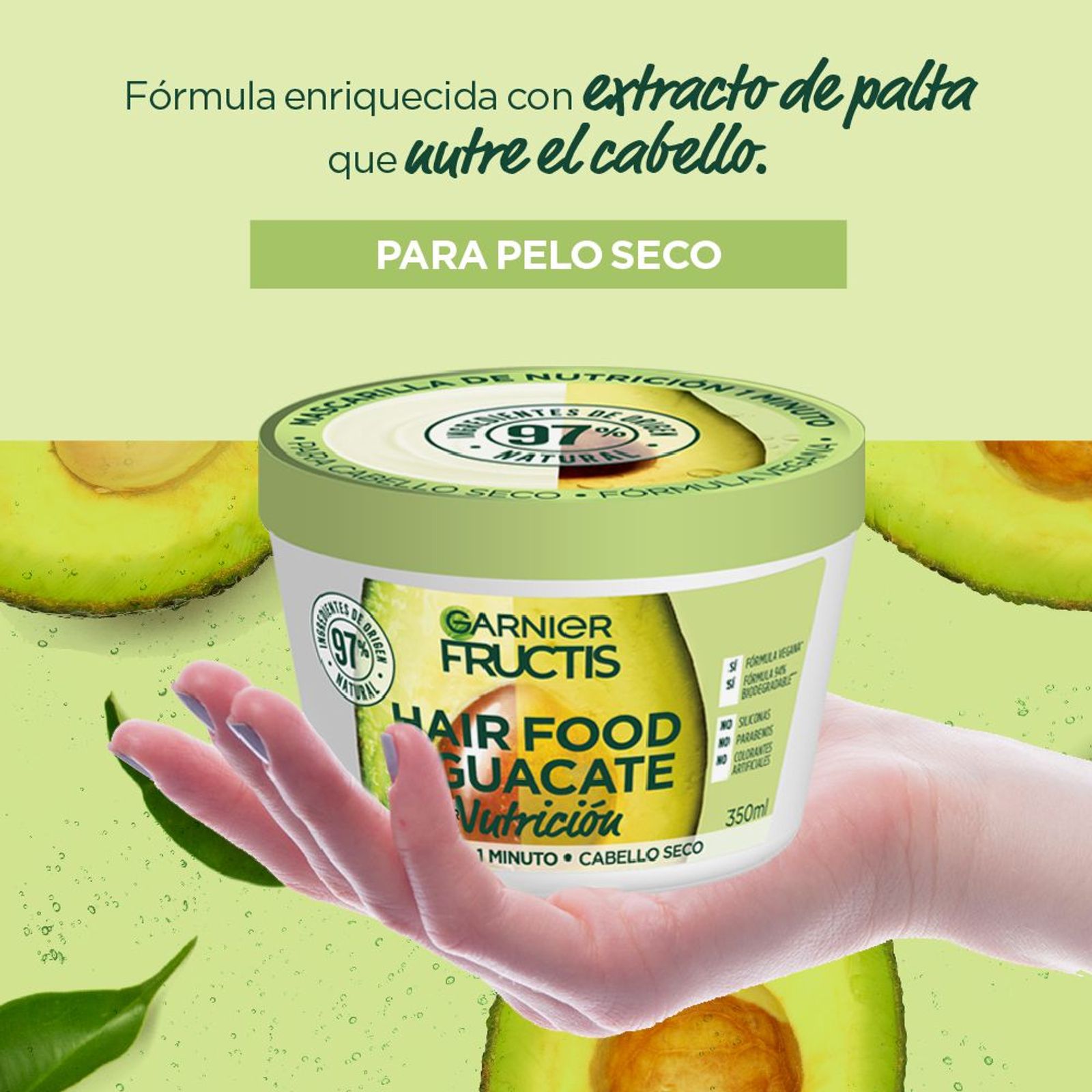 ¿Pelo seco? Mascarilla Fructis Hair Food Palta para nutrir tu pelo en 1 minuto. Con 97% de ingredientes de origen natural, fórmula vegana y 98% biodegradable. No tiene siliconas, ni parabenos, ni colorantes artificiales. Además, es Cruelty Free.