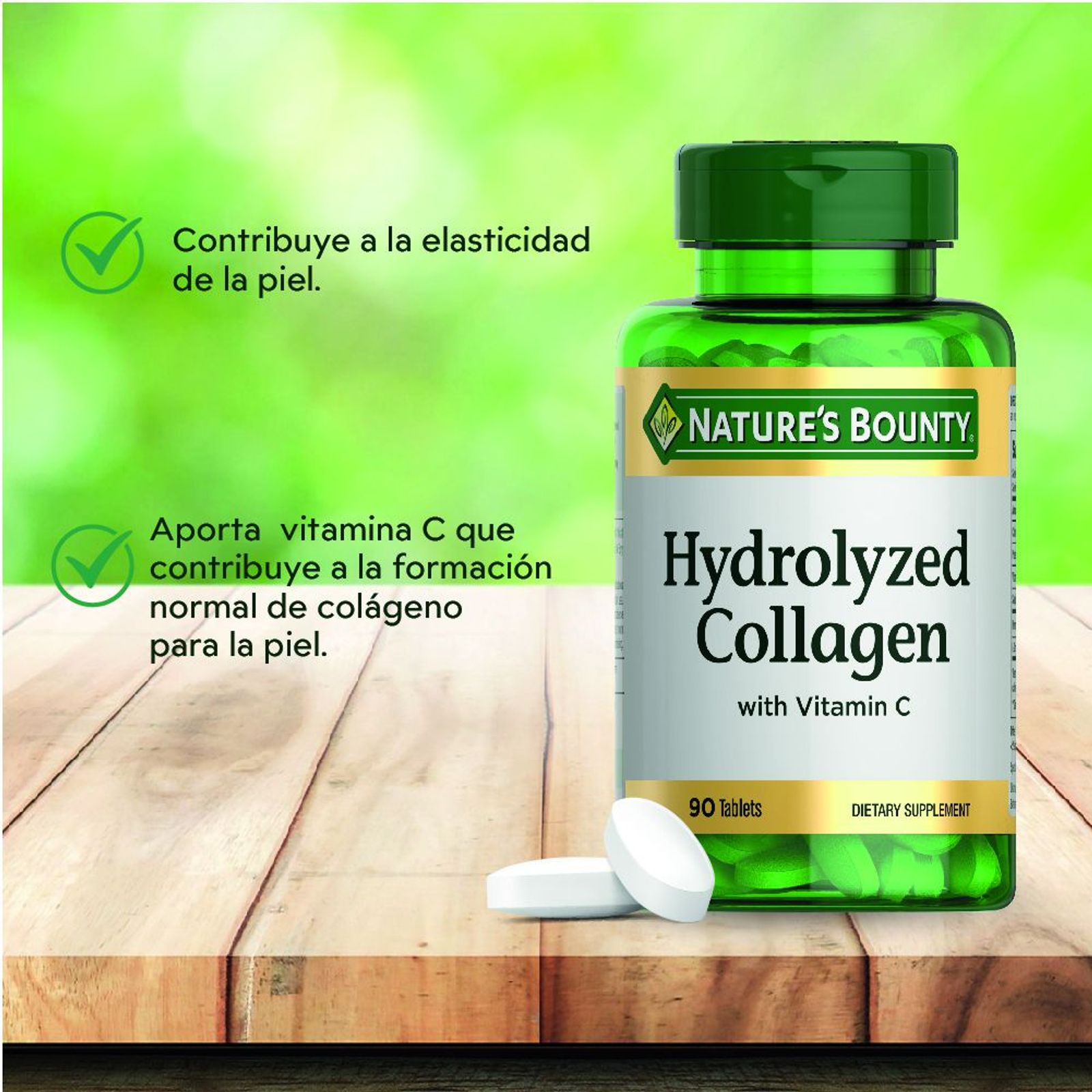 El Colágeno Hidrolizado de Nature?s Bounty es un complemento alimenticio que ayuda en la rutina de belleza diaria y contiene 100% de proteína pura. El producto también aporta vitamina C que contribuye a la formación normal de colágeno para la piel. El colágeno es una proteína estructural compleja que se encuentra fundamentalmente en los tejidos fibrosos tales como tendones, ligamentos, cartílago, hueso y piel. El colágeno hidrolizado está constituido por aminoácidos, que contribuyen a la formación de colágeno nuevo en el cuerpo. DESCRIPCIÓN -Mejora la firmeza y la elasticidad de la piel -Fortalece las uñas y el cabello mejorando su aspecto -Previene y mitiga los síntomas de la osteoporosis -Previene y retarda la aparición de arrugas, líneas de expresión y celulitis -Tonifica las articulaciones, tendones y ligamentos -Controla la presión arterial -Sin gluten