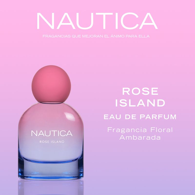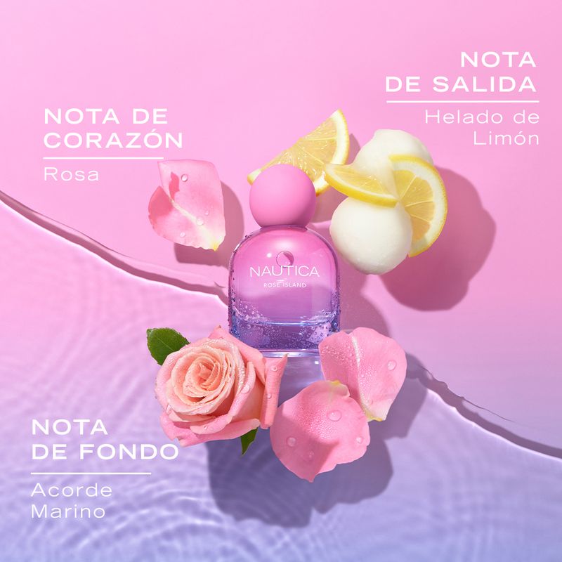 Nautica Rose Island es una fragancia que eleva el estado de ánimo, ideal para quienes buscan esa energía y sensación de felicidad que se siente cuando el sol y la arena acarician la piel al salir del océano. Con una fórmula vegana y limpia, este eau de parfum de larga duración está estructurado en torno a un acorde de sorbete de limón y notas de mandarina, equilibradas con toques de rosa, bambú fresco y manzana.