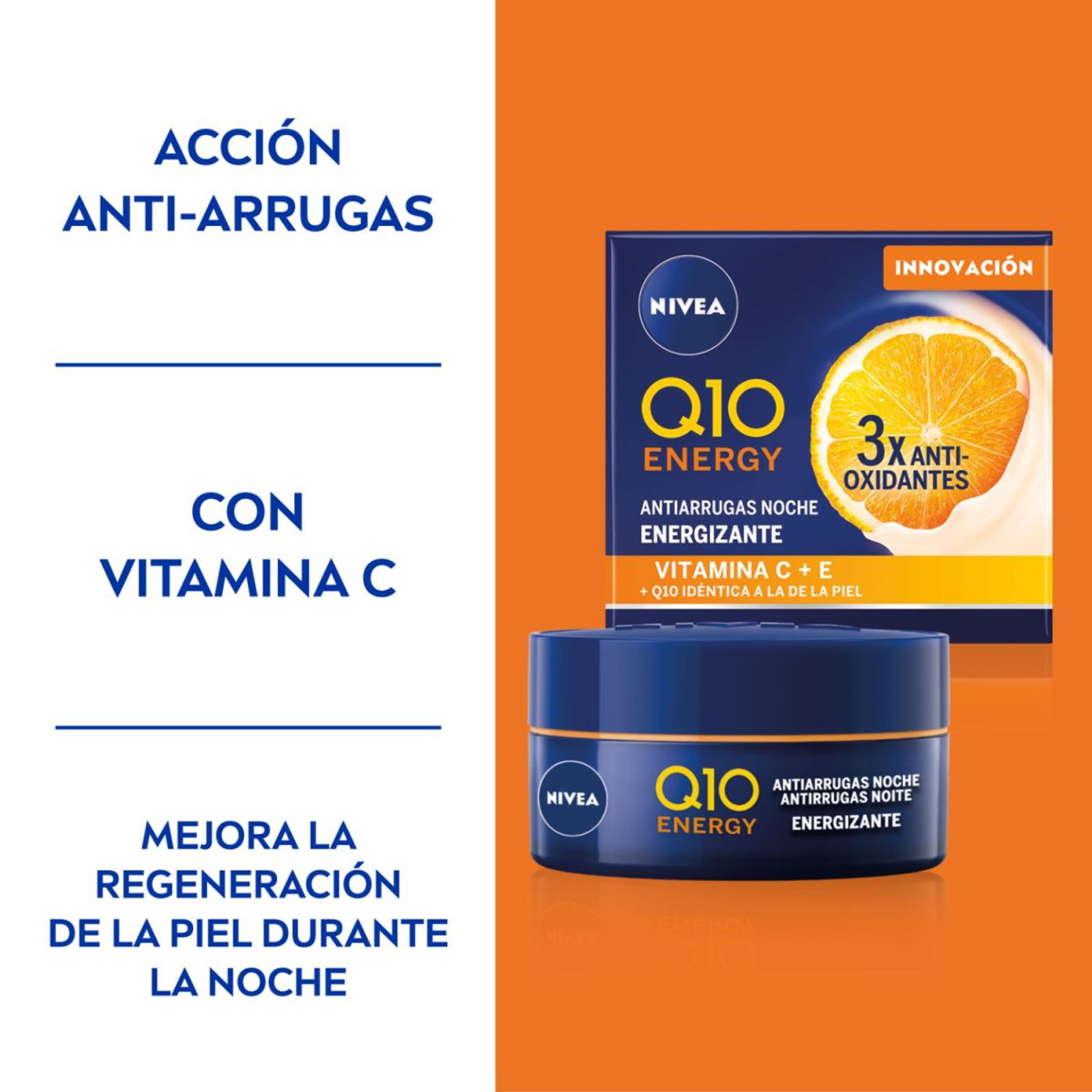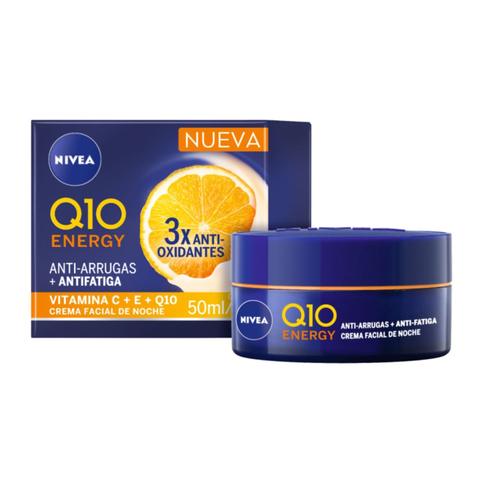 La Crema facial de noche NIVEA Q10 Energy te ayuda a lucir una piel más radiante y un aspecto saludable en ocho horas, mejorando la regeneración de la piel durante la noche. Su fórmula contiene Vitamina C, Vitamina E, Q10 y Extracto Natural de Naranja, ingredientes que mejoran el bloqueo de humedad de la piel y fortalecen la barrera cutánea.