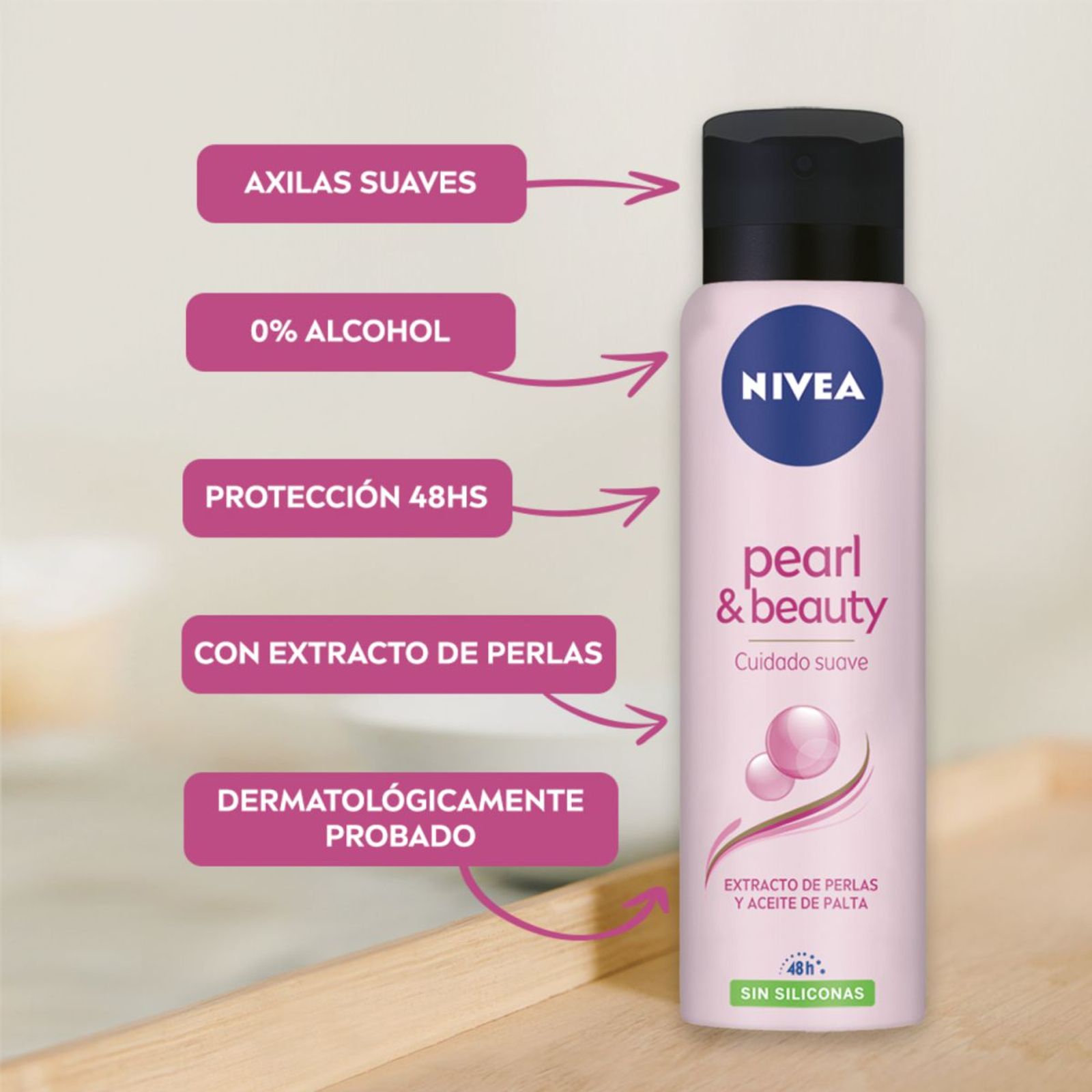El Desodorante antitranspirante NIVEA Pearl & Beauty en aerosol y sin siliconas ofrece una protección eficaz durante 48 hs y una suave fragancia dejando tus axilas suaves. Gracias a su innovadora fórmula con Extracto de Perlas y está enriquecido con aceite de palta, brinda a tus axilas un tono parejo, suaviza y humecta. Adecuado para todo tipo de pieles NIVEA es la marca Nº 1 en el cuidado de la piel en el Mundo y en Argentina, con más de 100 años de trayectoria. Desde que inventamos la primera crema, NIVEA Creme, desarrollamos investigación constante para producir innovaciones que atiendan a cada necesidad de la piel de toda la familia. Nuestros investigadores se centran especialmente en la individualidad de la piel humana y en las diferentes necesidades de cuidado. Lo que ha dado como resultado que en las últimas décadas hayamos creado numerosos productos innovadores para el cuidado de la piel, desde desodorantes hasta productos de protección solar BENEFICIOS – 48 horas de protección – Contiene Extracto de Perla: Tono parejo para las axilas – Sin siliconas – Con aceite de palta: Brinda una sensación de suavidad y humectación – Apto para todo tipo de piel MODO DE USO: 1) Agitar bien el envase antes de usar 2) Aplicar NIVEA Pearl & Beauty a 15 cm de distancia de las axilas de manera uniforme y pareja 3) Dejar de secar antes de colocar la prenda de vestir
