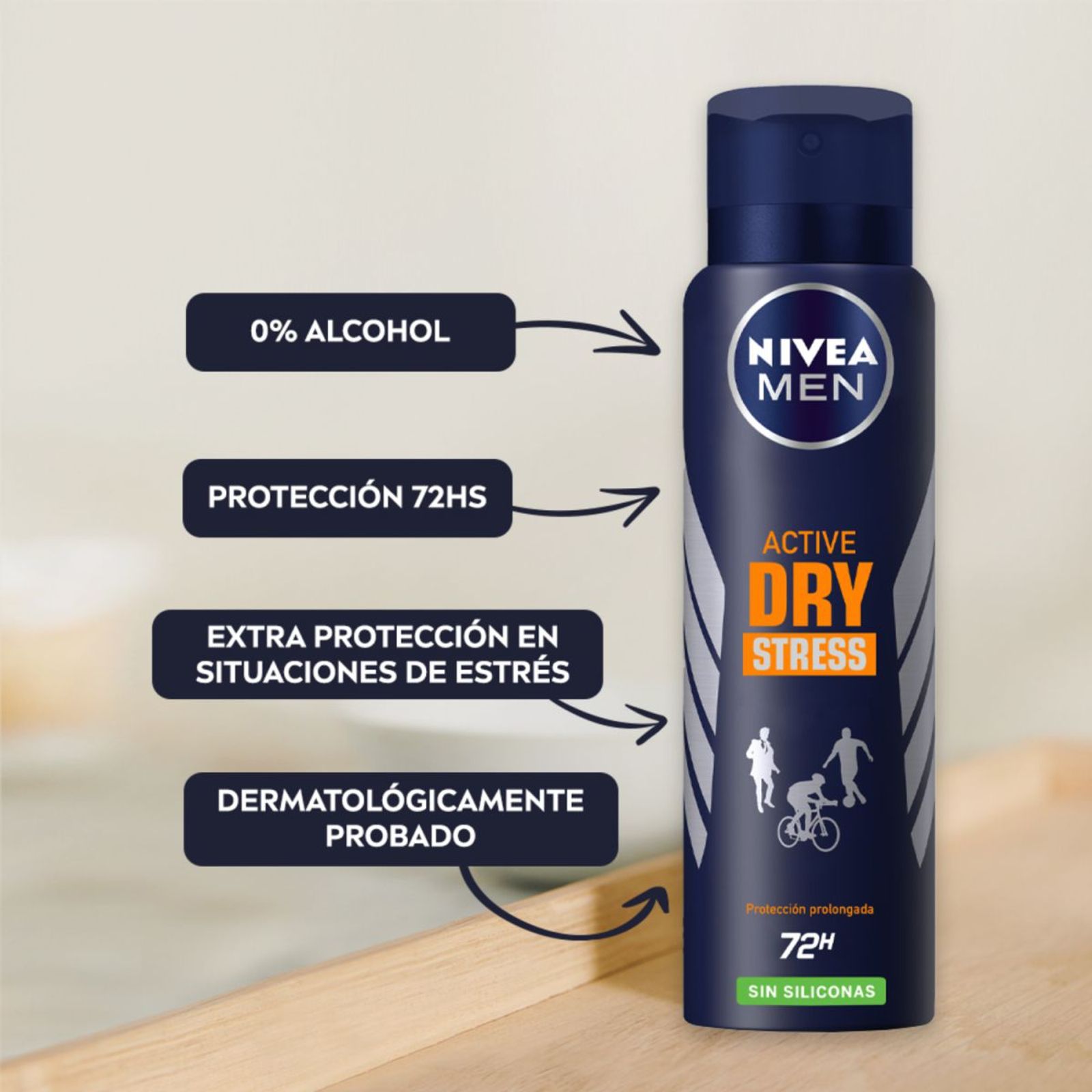 El Desodorante antitranspirante NIVEA MEN Active Dry Stress en aerosol y sin siliconas ofrece 48 horas de protección. Está científicamente probado que reduce hasta en un 50% la transpiración en momentos de estrés. Cuenta con una fórmula única que combina un complejo de Zinc y activos Stress Protect, ingredientes que brindan un cuidado confiable. Ideal para todo tipo de pieles. NIVEA es la marca Nº 1 en el cuidado de la piel en el Mundo y en Argentina, con más de 100 años de trayectoria. Desde que inventamos la primera crema, NIVEA Creme, desarrollamos investigación constante para producir innovaciones que atiendan a cada necesidad de la piel de toda la familia. Nuestros investigadores se centran especialmente en la individualidad de la piel humana y en las diferentes necesidades de cuidado. Lo que ha dado como resultado que en las últimas décadas hayamos creado numerosos productos innovadores para el cuidado de la piel, desde desodorantes hasta productos de protección solar BENEFICIOS – 48 horas de protección – Con activos StressProtect y complejo de Zinc: Extra protección en situaciones de estrés – Sin siliconas – 0% alcohol – Apto para todo tipo de piel MODO DE USO: 1) Agitar bien el envase antes de usar 2) Aplicar NIVEA MEN Active Dry Stress a 15 cm de distancia de las axilas de manera uniforme y pareja3) Dejar de secar antes de colocar la prenda de vestir