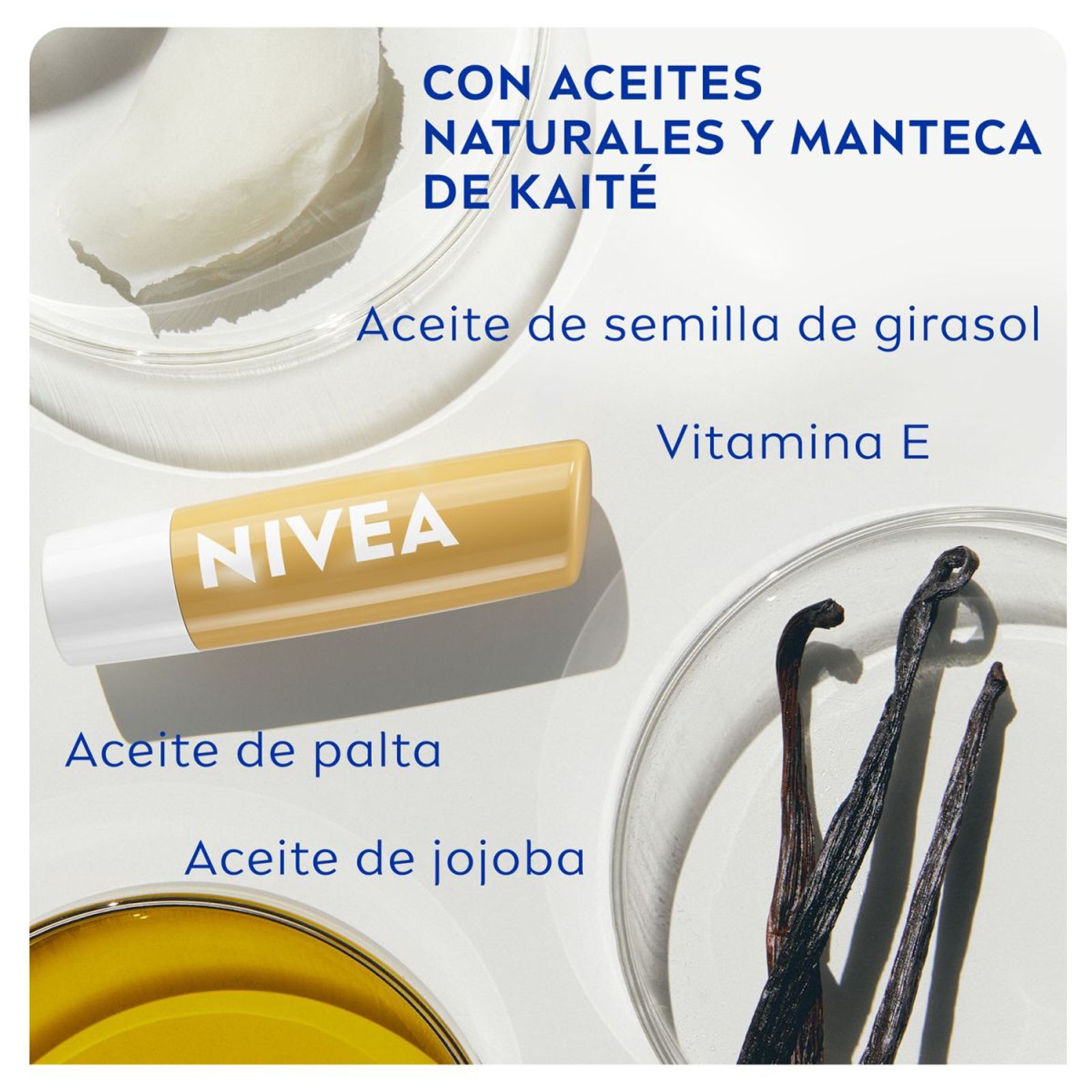 El Protector labial humectante NIVEA Vainilla Buttercream cuida los labios para mantenerlos suaves y protegerlos del resecamiento durante todo el día. Además, mantiene los labios hidratados por 24 horas. Su fórmula está enriquecida con Manteca de Karité, Aceite de Jojoba y Aceite de Aguacate, ingredientes que brindan el cuidado nutritivo que merecen los labios. Es adecuado para todo tipo de pieles y está probado dermatológicamente. BENEFICIOS – Mantiene tus labios hidratados durante 24 horas protegiéndolos del frío, el viento y el aire seco – Con un delicioso y dulce aroma a vainilla para una sensación suave en los labios – Fórmula mejorada con Manteca de Karité de origen ético y Aceites Naturales enriquecidos con Vitaminas – Con 99% de ingredientes de origen natural y sin aceites minerales – Tiene una textura suave que se funde instantáneamente en tus labios MODO DE USO Aplicar uniformemente el Protector labial humectante NIVEA Vainilla Buttercream las veces que sea necesario sobre el área de los labios