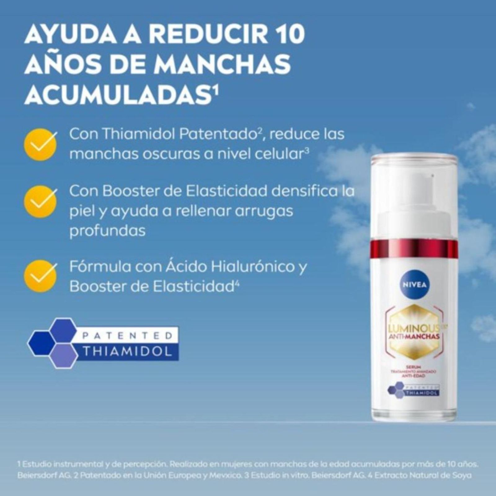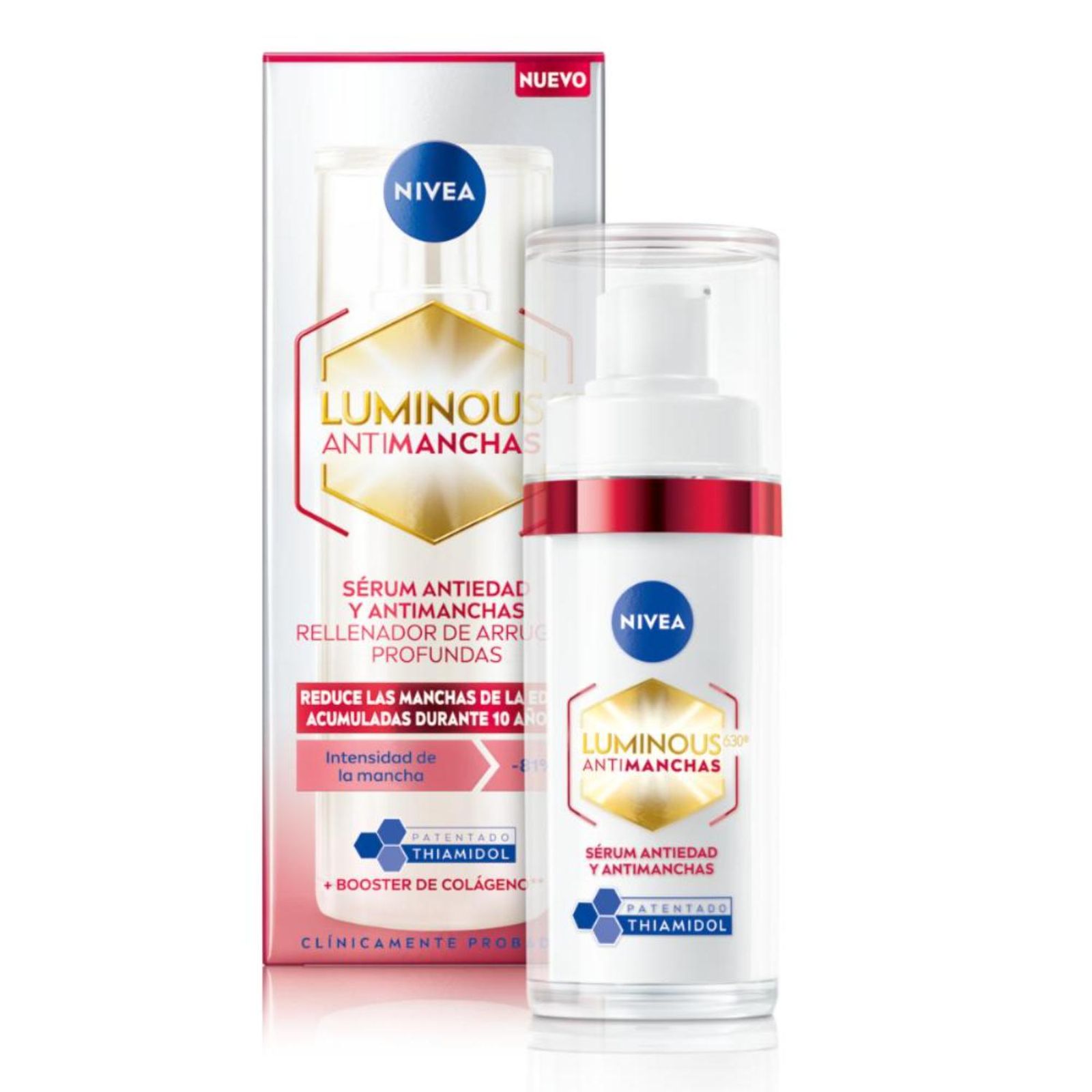 El Serum Anti-Manchas y Anti-Edad NIVEA Luminous630 contiene ingredientes potentes que ayudan a reducir hasta 10 años de signos de envejecimiento acumulados. Su fórmula está enriquecida por Ácido Hialurónico y Thiamidol, que nutre profundamente la piel, elimina la pigmentación, reduce las líneas finas, mejora la elasticidad de la piel y rellena incluso las arrugas profundas en 7 días. Agrega este sérum a tu rutina diaria de cuidado de la piel para devolver rejuvenecimiento y vitalidad a tu piel.