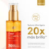 ¿Sabías que los rayos UV dañan 4 veces más el cabello que las herramientas de calor? Si tu pelo luce opaco y sin brillo debido a la exposición solar, llegó la solución que estabas esperando: el nuevo Óleo Sérum Bifásico Dove UV Repair and Glow. Este óleo sérum está especialmente desarrollado para vos, que buscás lo mejor para tu pelo y querés repararlo del daño que le hacen los rayos UV. Nuestra fórmula innovadora incorpora un factor de protección capilar 70 y 12% Sérum Ferúlico. Con esta tecnología patentada, reparará el 99% del daño acumulado y fortalecerá tu pelo. Dove, experta en reparación de daños, ha desarrollado este producto para cabellos dañados, que neutraliza y repara los daños internos. La tecnología Bio-Protein Care fortalece tu pelo, combatiendo el daño que lo deja opaco y sin brillo.