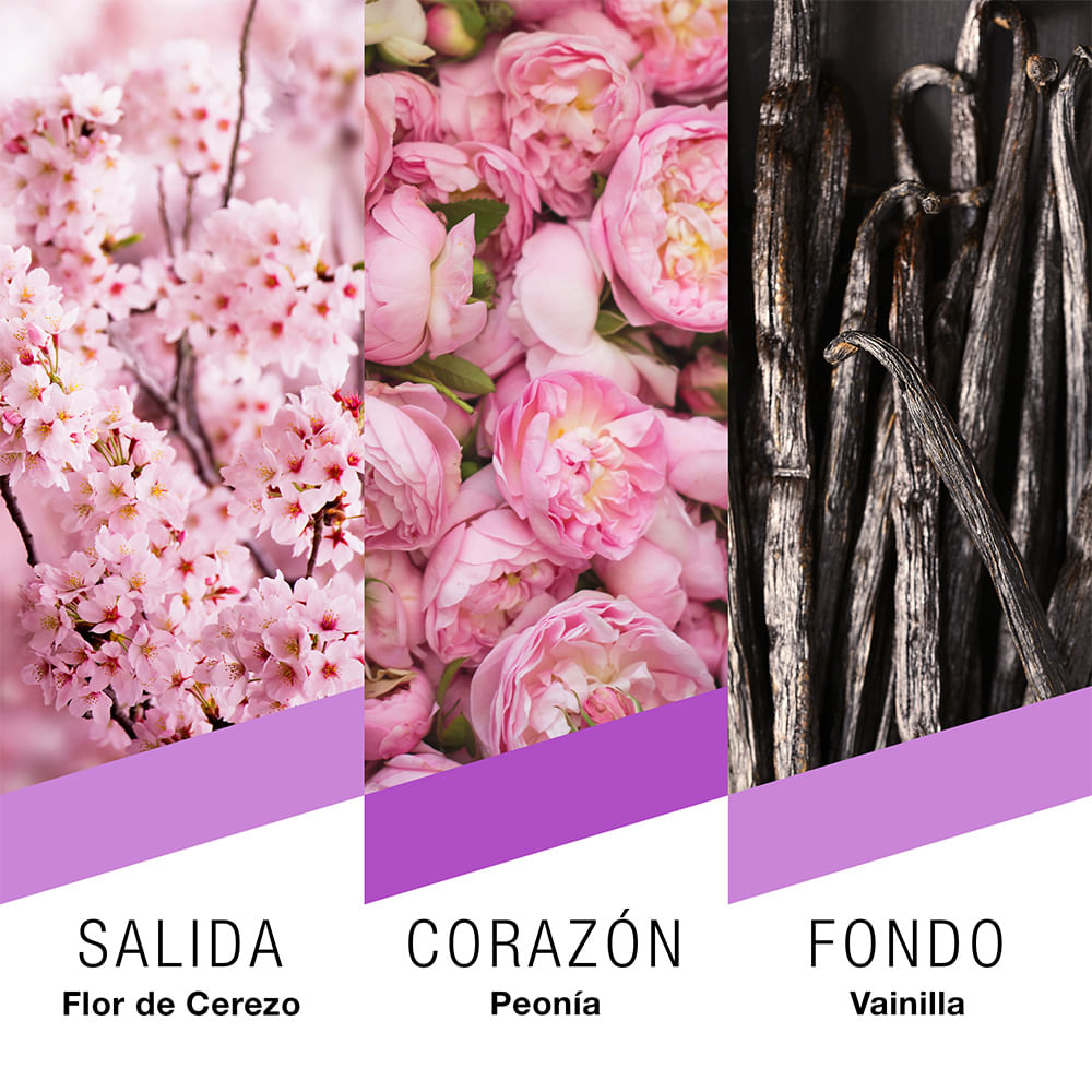 Recorré Tokio: un aroma floral frutal que captura la primavera en la ciudad con notas de flor de cerezo y peonía, envueltas en un toque sensual de vainilla y sándalo.