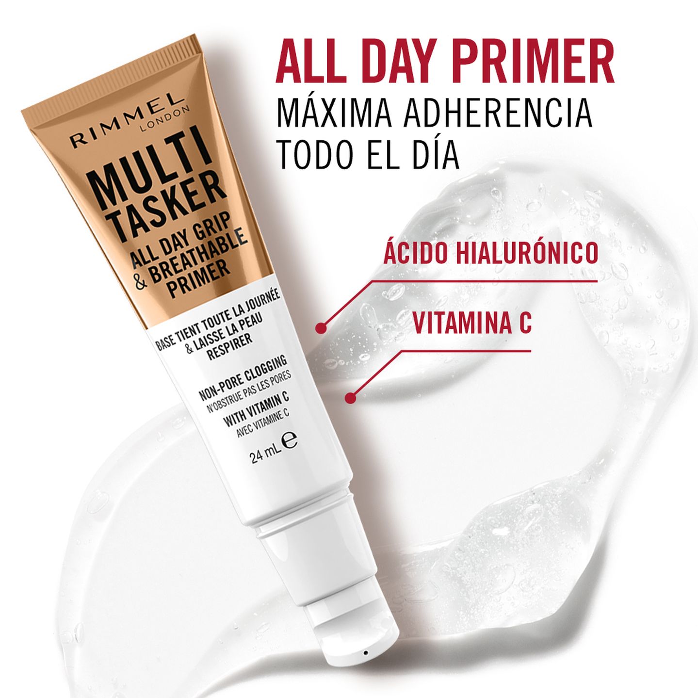 Rimmel Multi-Tasker Primer es una prebase ligera con textura de gel. Este primer facial tiene una fórmula vegana con Vitamina C y Ácido Hialurónico. Se puede utilizar para preparar la piel para el maquillaje o utilizarla sin maquillaje como gel hidratante. El maquillaje queda fijado durante todo el día, con un efecto alisador para realzar el cutis. Un primer de maquillaje que hidrata al instante, deja respirar la piel y no obstruye los poros. • Primer facial con poder de fijación durante todo el día. • Con ácido hialurónico y vitamina D. • Hidratación instantánea.