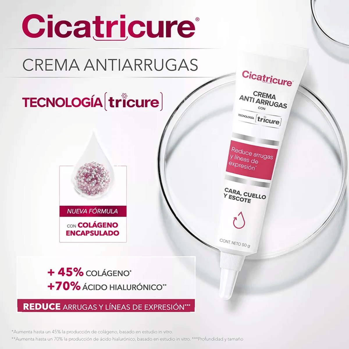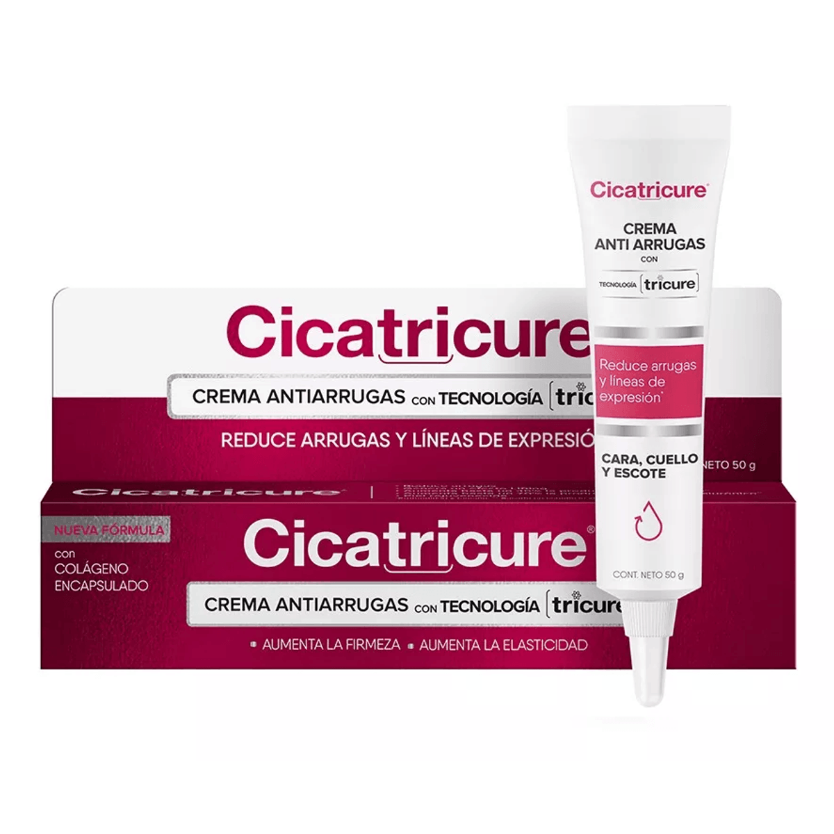 Cicatricure Crema antiedad con Tecnología Tricure. Esta nueva tecnología, actúa en profundidad gracias a su composición con colágeno encapsulado en una liberación controlada y sostenida de los activos, permitiendo tratar la piel de adentro hacia afuera. BENEFICIOS: – ANTIARRUGAS: Reduce arrugas y lineas de expresión – FIRMEZA: Aumenta la fiermeza y la elasticidad – NUEVA FÓRMULA: Con colágeno encapsulado – RESULTADOS: reduce la profundidad y el tamaño de las arrugas y líneas de expresión. Aumenta la firmeza y la elasticidad de la piel MODO DE USO: Aplique en cara cuello y escote sobre la peil limpia y seca, por la mañana y por la noche, con movimientos ascendentes hasta que se absorba. Uso diario