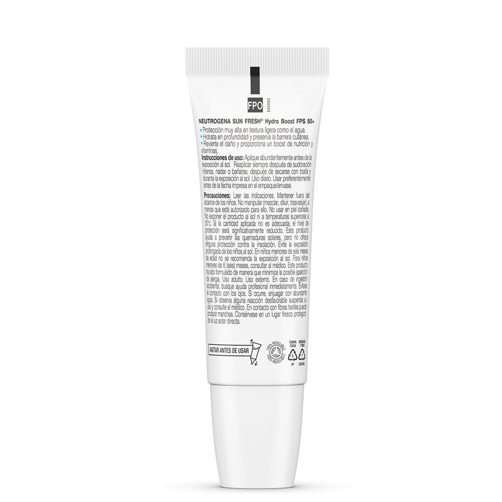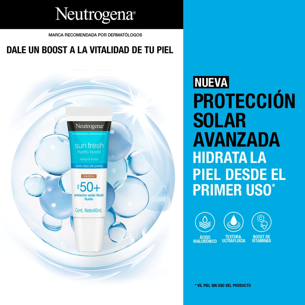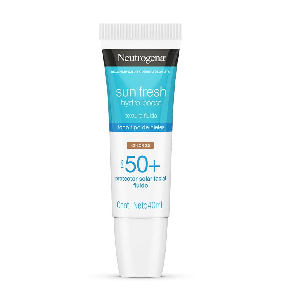 Protector Solar Neutrogena Hydro Boost Tono Medio Fps50 x 40 ml.NEUTROGENA SUN FRESH Hydro Boost FPS 50+ Tono Medio: Cuenta con una textura fluida, para todo tipo de piel. Su exclusiva tecnología HELIOPLEX™ SL ofrece una protección muy alta, formando una barrera protectora contra los rayos UV, la luz visible y la contaminación. Proporciona un boost de hidratación y vitaminas, para revertir los daños causados por el sol y preservar la vitalidad de la piel. Con Ácido Hialurónico, que hidrata profundamente durante 12 horas. Niacinamida: un activo aclarador de las manchas causadas por el sol; Vitamina C y E: que funcionan como antioxidantes para la piel.