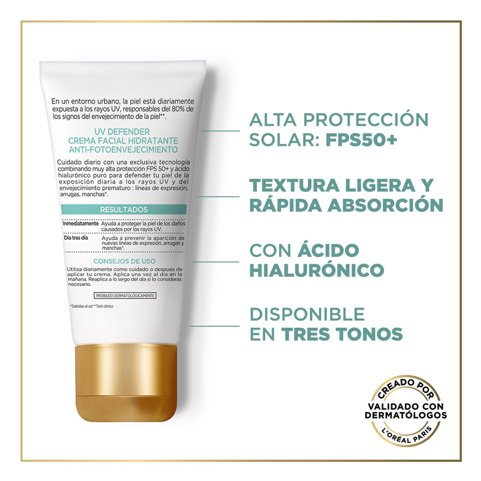 Conocé el nuevo UV Defender FPS50+ de L’Oréal Paris, un protector solar de textura ligera y rápida absorción, capaz de resuguardar tu piel diariamente de los rayos UVB y UVA, máximos responsables de los signos de envejecimiento prematuro (manchas oscuras, líneas de expresión y arrugas) y del cáncer de piel. Además, mantiene tu piel hidratada gracias a su contenido de ácido hialurónico. Probálo en su versión Hidratante o Anti-brillo; disponible en tres tonos: neutro, medio y claro. Apto para todo tipo de piel.