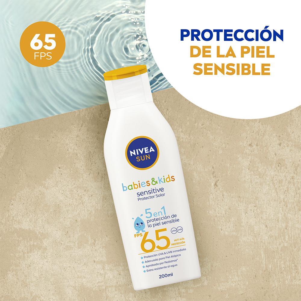 El Protector solar Nivea Sun Babies & Kids Sensitive 5 en 1 protege de forma inmediata las quemaduras solares. Su fórmula 67% biodegradable con Camomila Orgánica está especialmente desarrollada para la piel sensible de los bebés y niños mayores de 6 meses. Contiene Fps 65 y brinda protección UVA/UVB inmediata. Es adecuado para la piel atópica, está aprobado por pediatras y es extra resistente al agua.