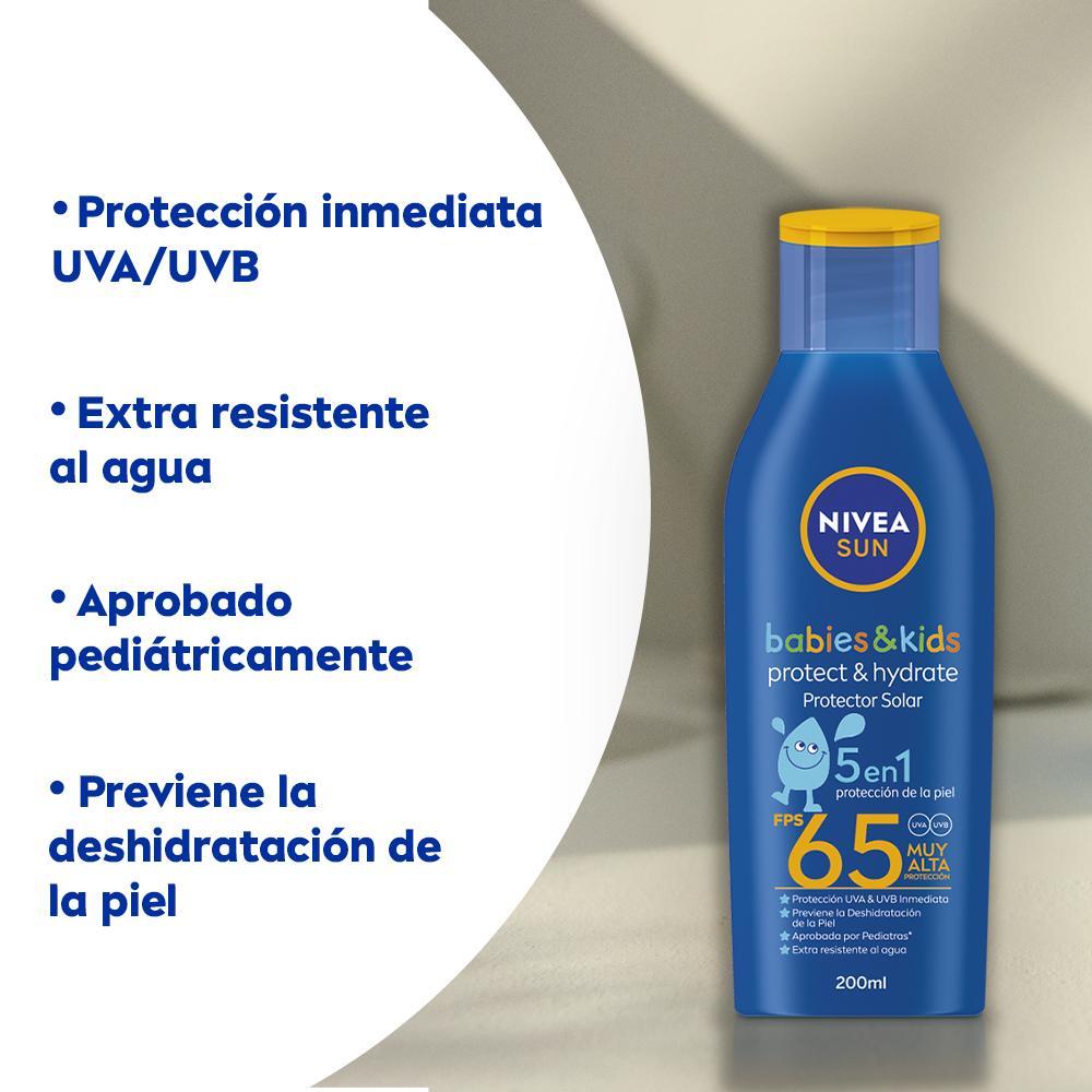 El Protector solar Nivea Sun Babies & Kids Protect & Hydrate 5 en 1 protege de forma inmediata de las quemaduras solares. Su fórmula es compatible para la delicada piel de los niños mayores de 3 años. Contiene Fps 65 y brinda protección UVA/UVB inmediata. Está aprobado por pediatras, previene la deshidratación de la piel y es extra resistente al agua.