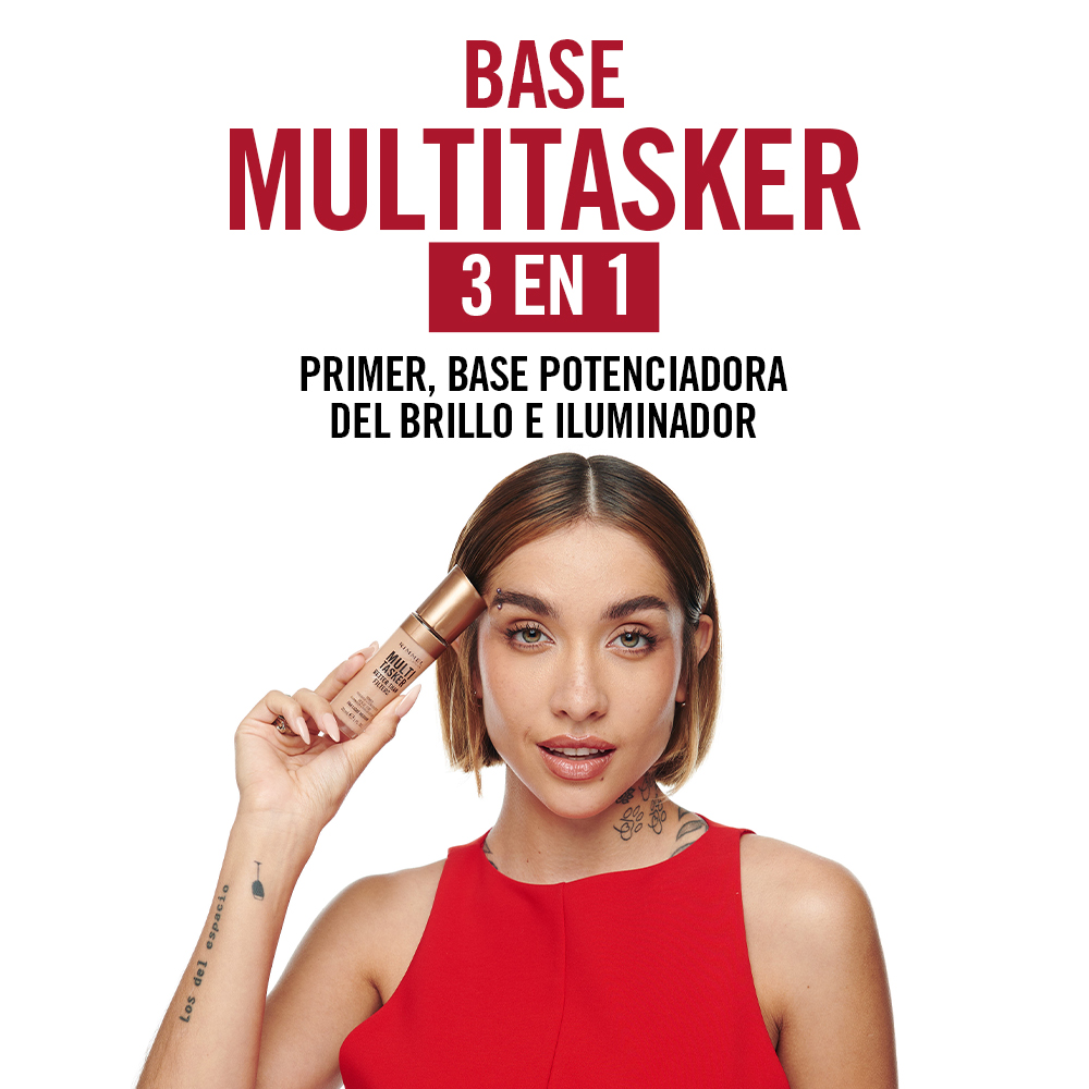 ¡Hola, la mejor piel de todas! Mejor que un filtro, brilla con tu mejor piel. Brilla de manera real, mejor que un filtro, con el Multi-Tasker 3 en 1: primer para la piel, base potenciadora de luminosidad e iluminador ¡Mejor que los filtros!